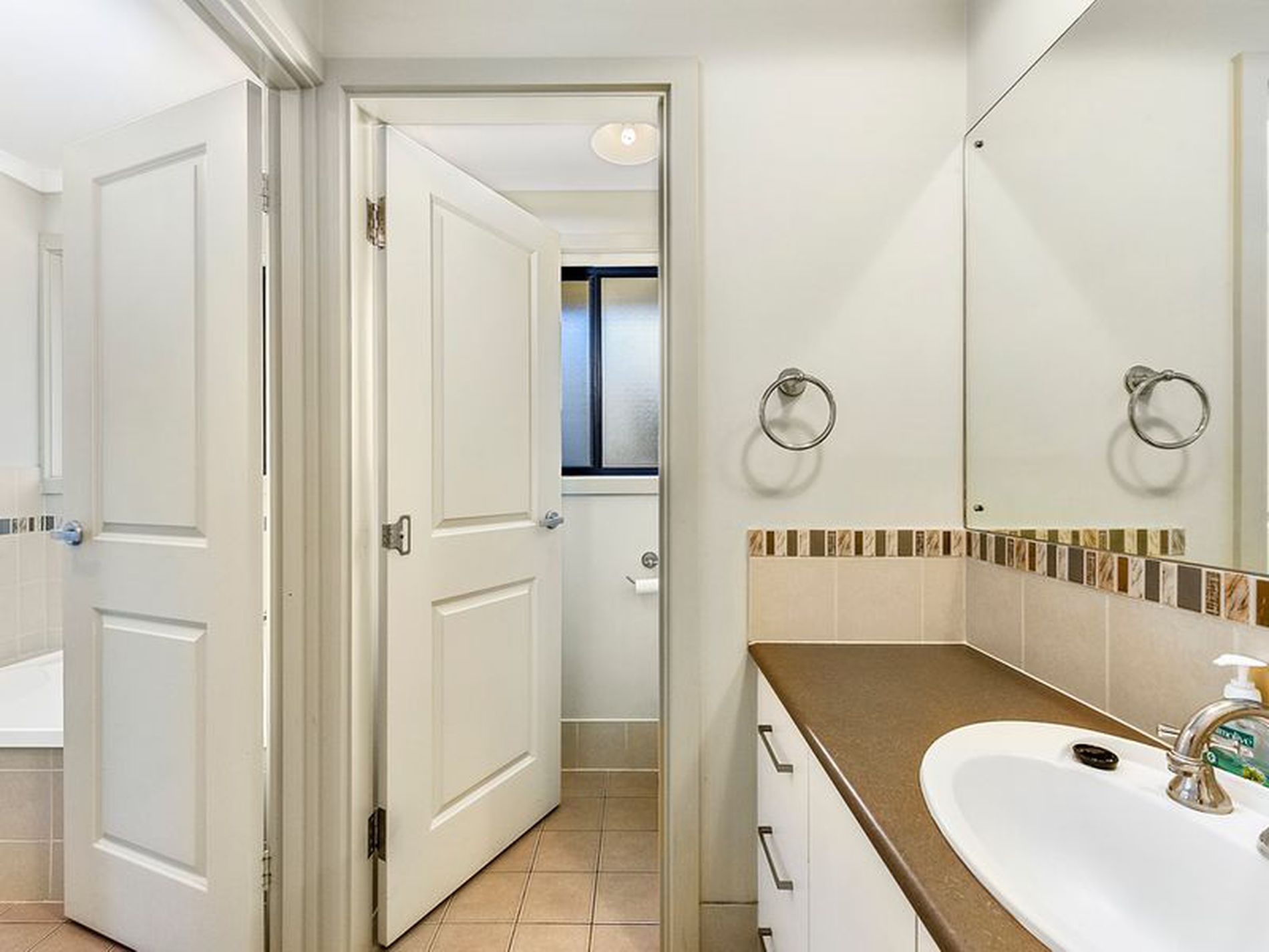 The tiled laundry has a rear door and built in cupboards.