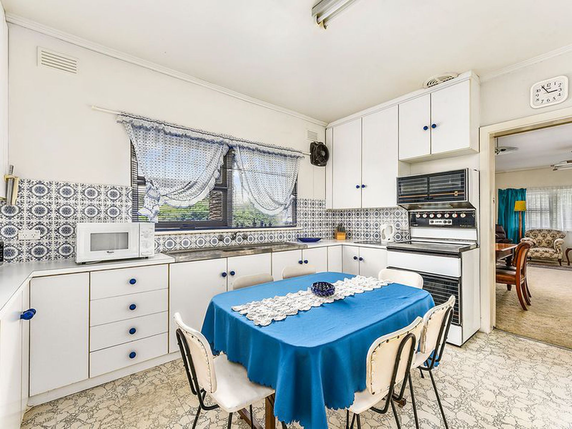 Spacious original kitchen with freestanding electric stove