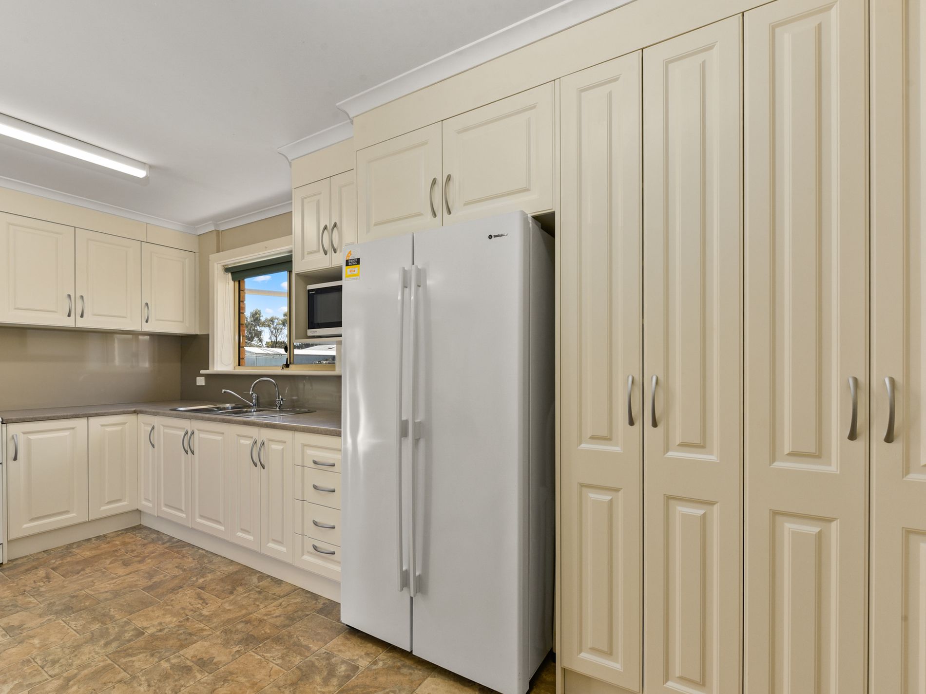 Step inside to a spacious lounge bathed in natural light streaming through a large picture window, where a cozy gas heater and reverse-cycle air conditioner ensure comfort all year round. The living space flows effortlessly into the open-plan kitchen and dining area, creating a welcoming hub for family life. The renovated kitchen is a true highlight, featuring bright white cabinetry, soft grey benchtops, and clever design that wraps around to the rear door, offering both functionality and style—a space where family meals and laughter naturally come together.