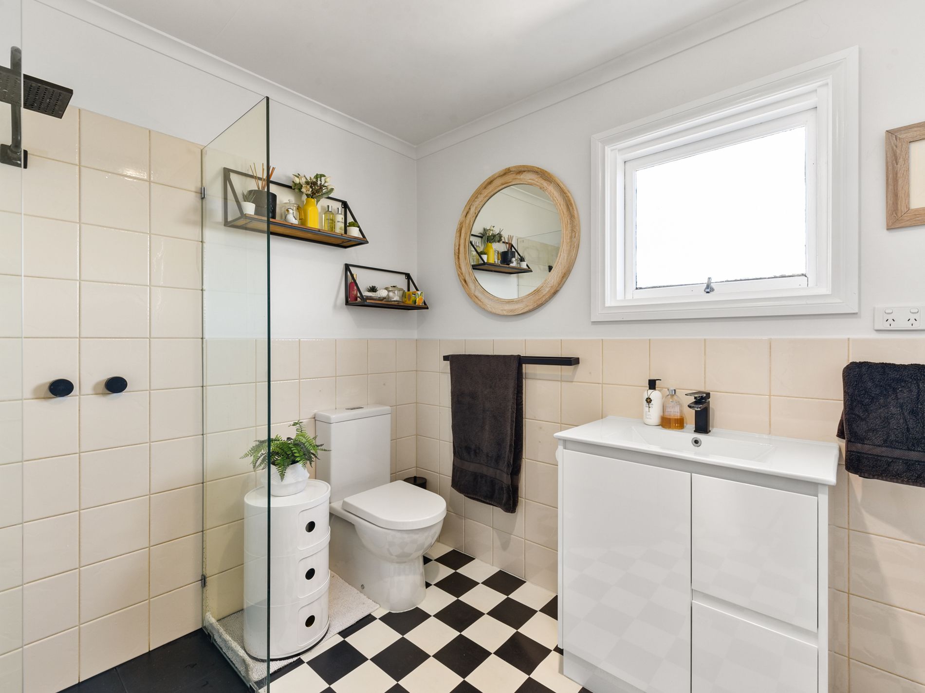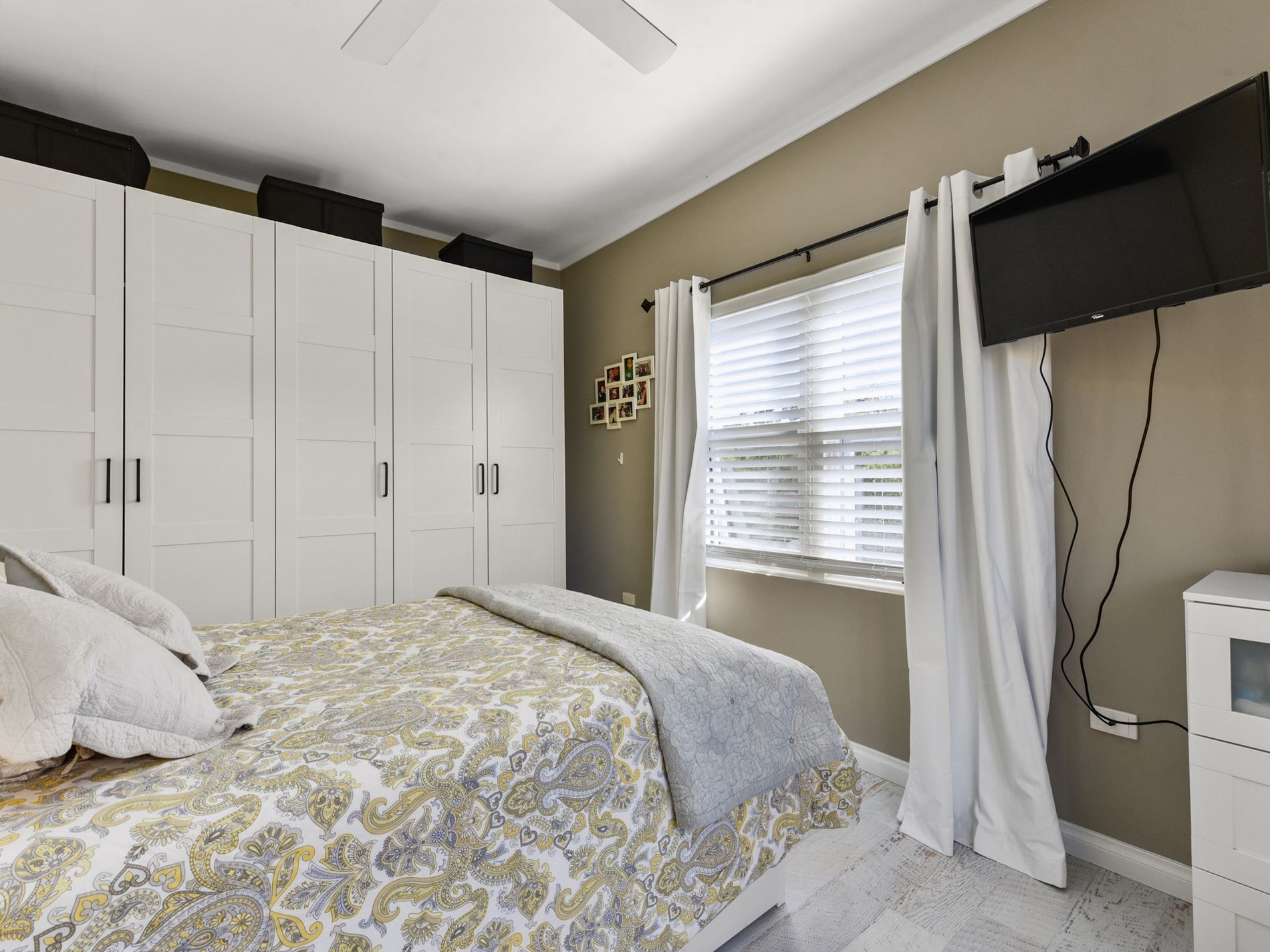 A generous, beautifully designed, tiled bathroom has a walk-in shower, toilet, and vanity. A compact laundry space and linen press are here also.