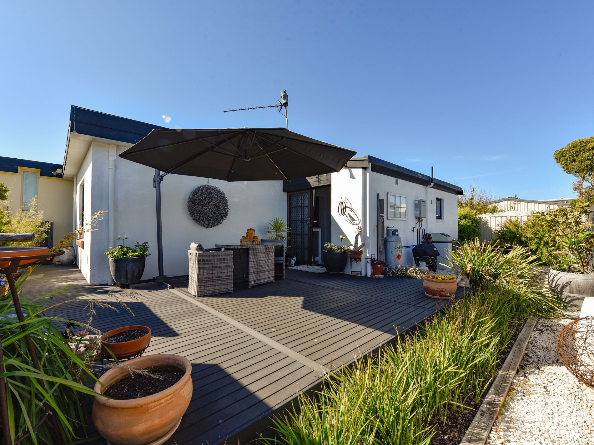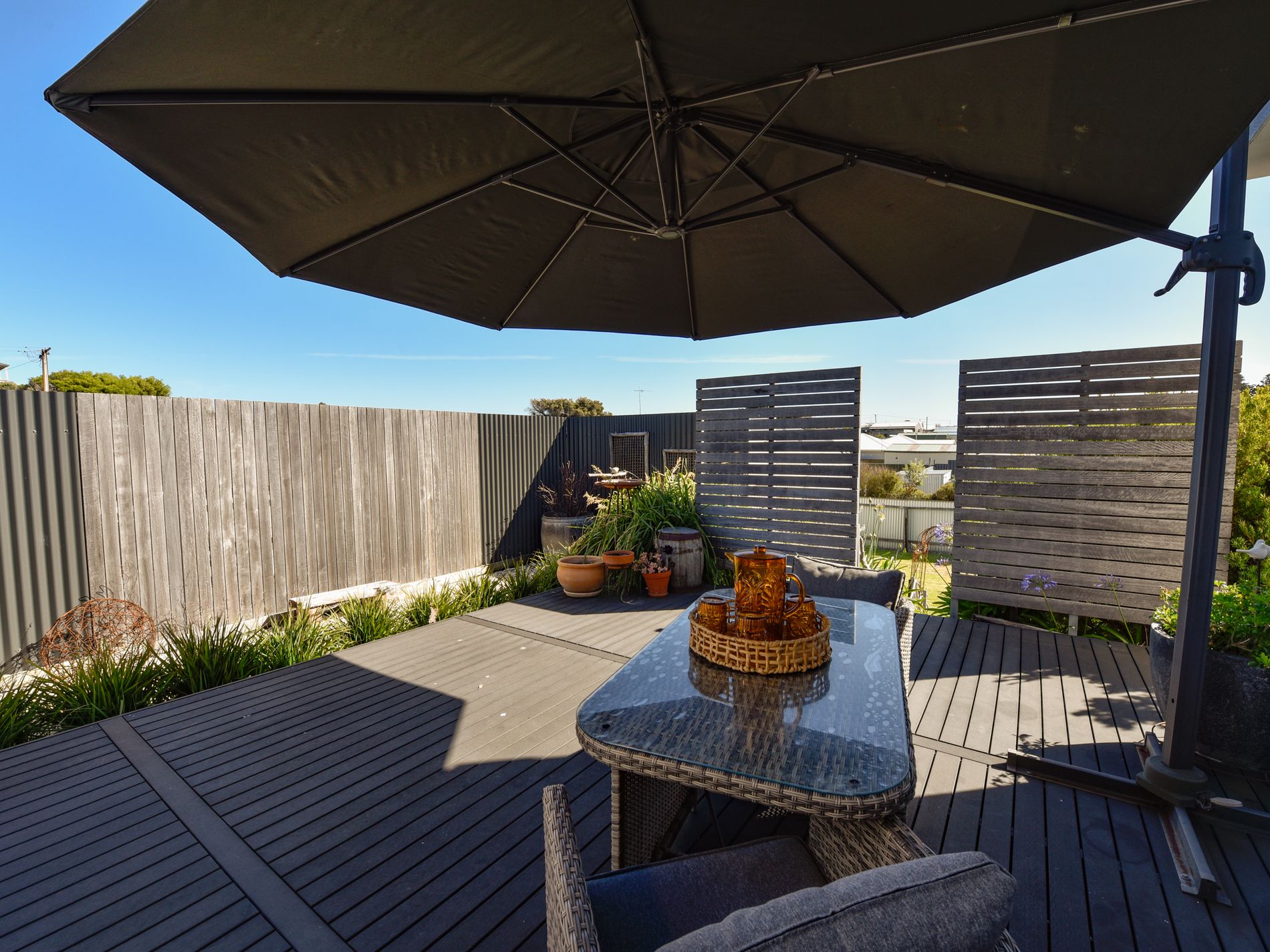 You have choices for outdoor entertaining depending on the weather and the occasion. A front patio area is a sheltered spot with room for outdoor sitting and dining. Its a perfect spot for the crazy plant lady in you to shine. The large deck off the kitchen is a perfect spot for entrtaining with plenty of room for your family and friends to enjoy a sunny breakfast or a sneaky happy hour after a day of swimming, surfing, and exploring in your 4WD.