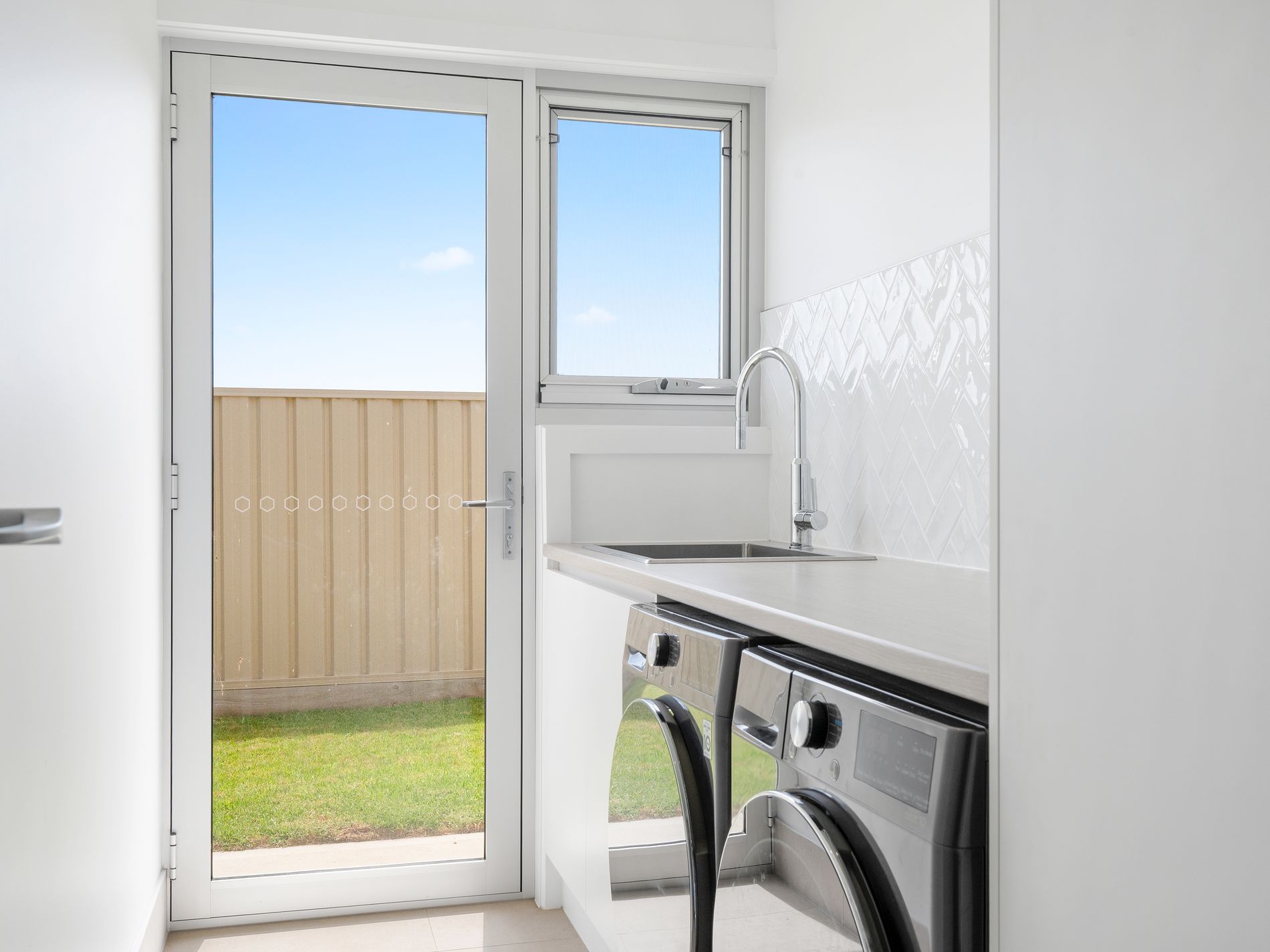 The laundry offers convenient side yard access, under-bench space for a washing machine and dryer, plus a double-door linen press for additional storage.