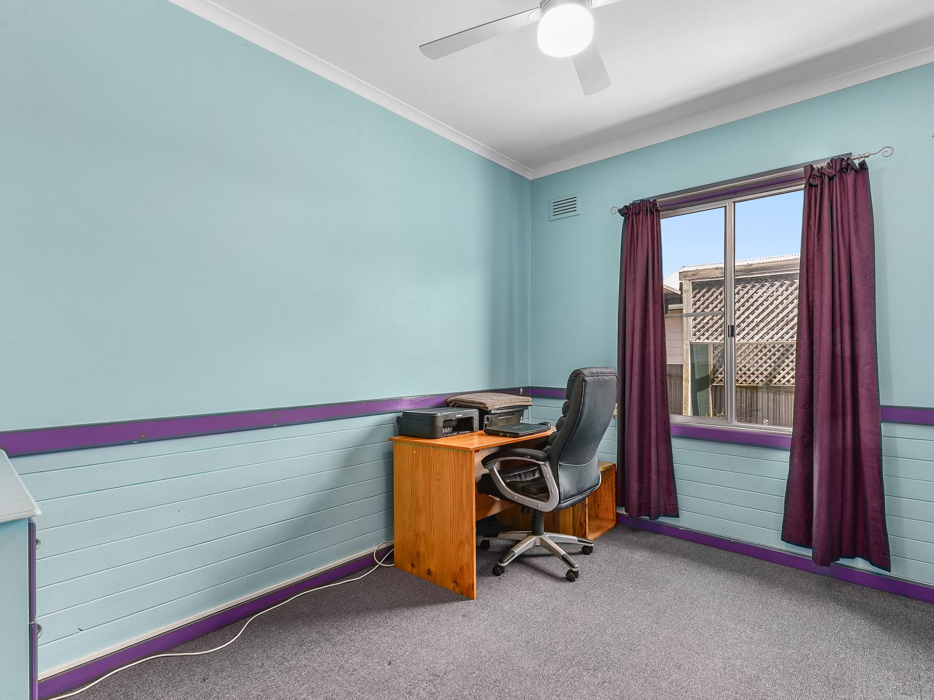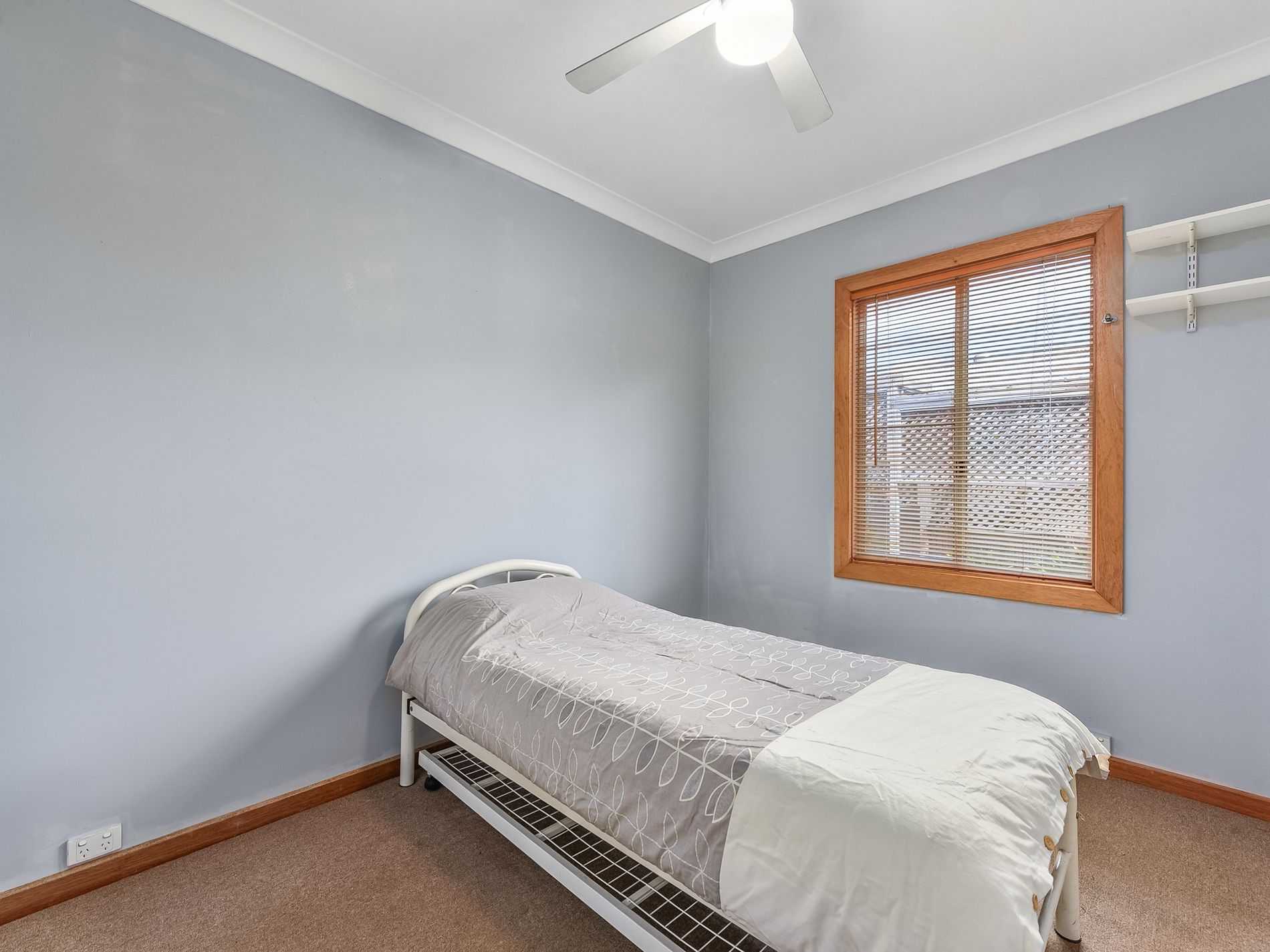 There are three carpeted bedrooms, each complete with blinds and ceiling fans. The master bedroom is complete built-in robes.