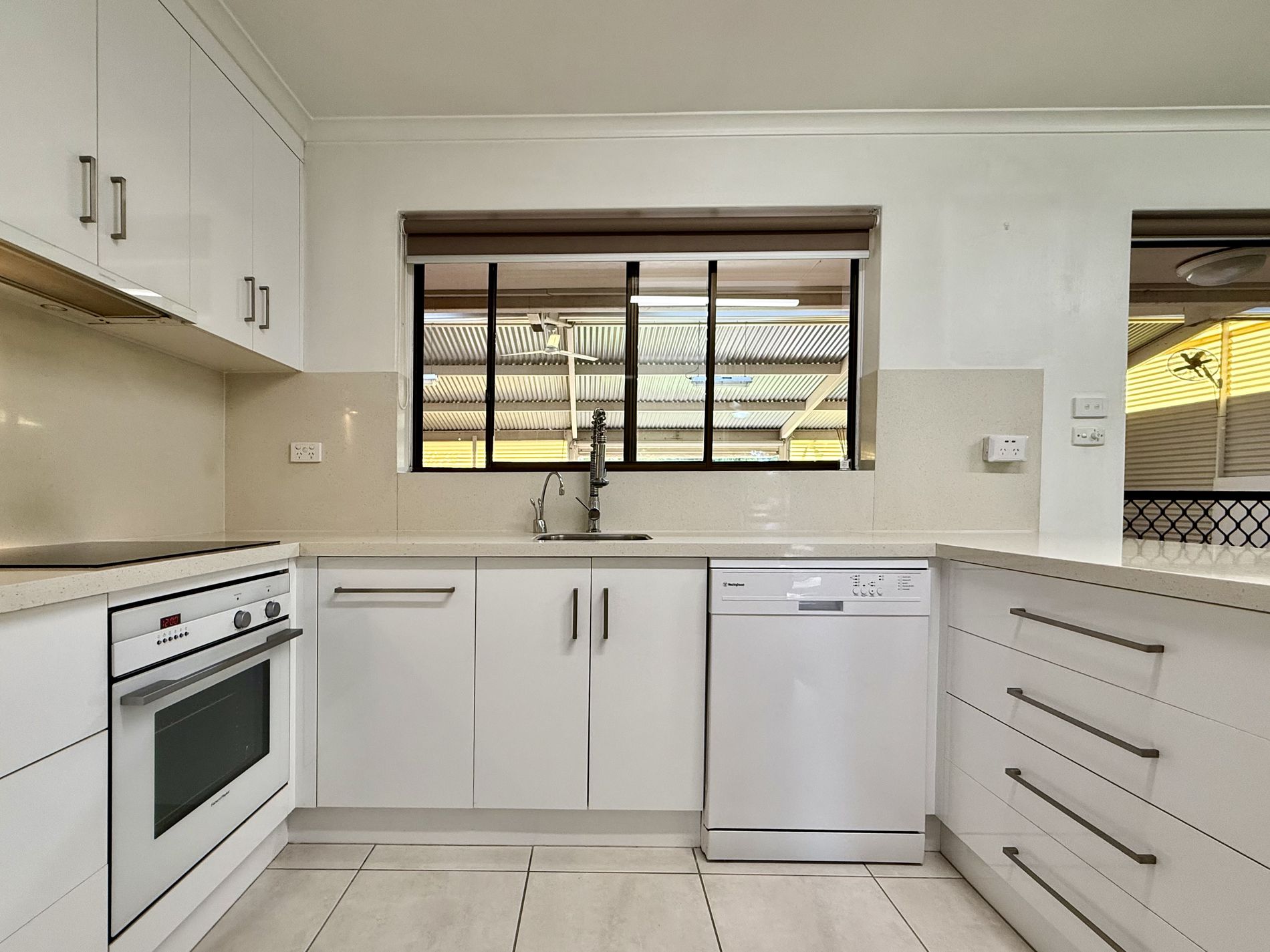 The beautifully updated kitchen overlooks the pergola and outdoor entertaining area, allowing the cook to remain part of the conversation. It features seamless white cabinetry and benchtops, all-electric cooking and a dishwasher, combining modern convenience with a clean and timeless design.