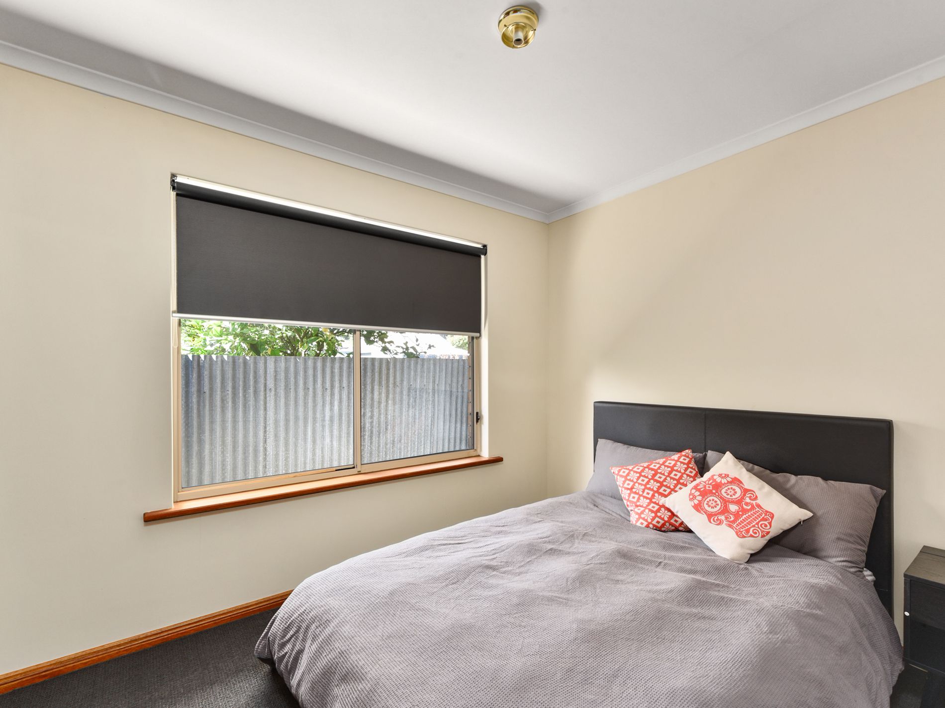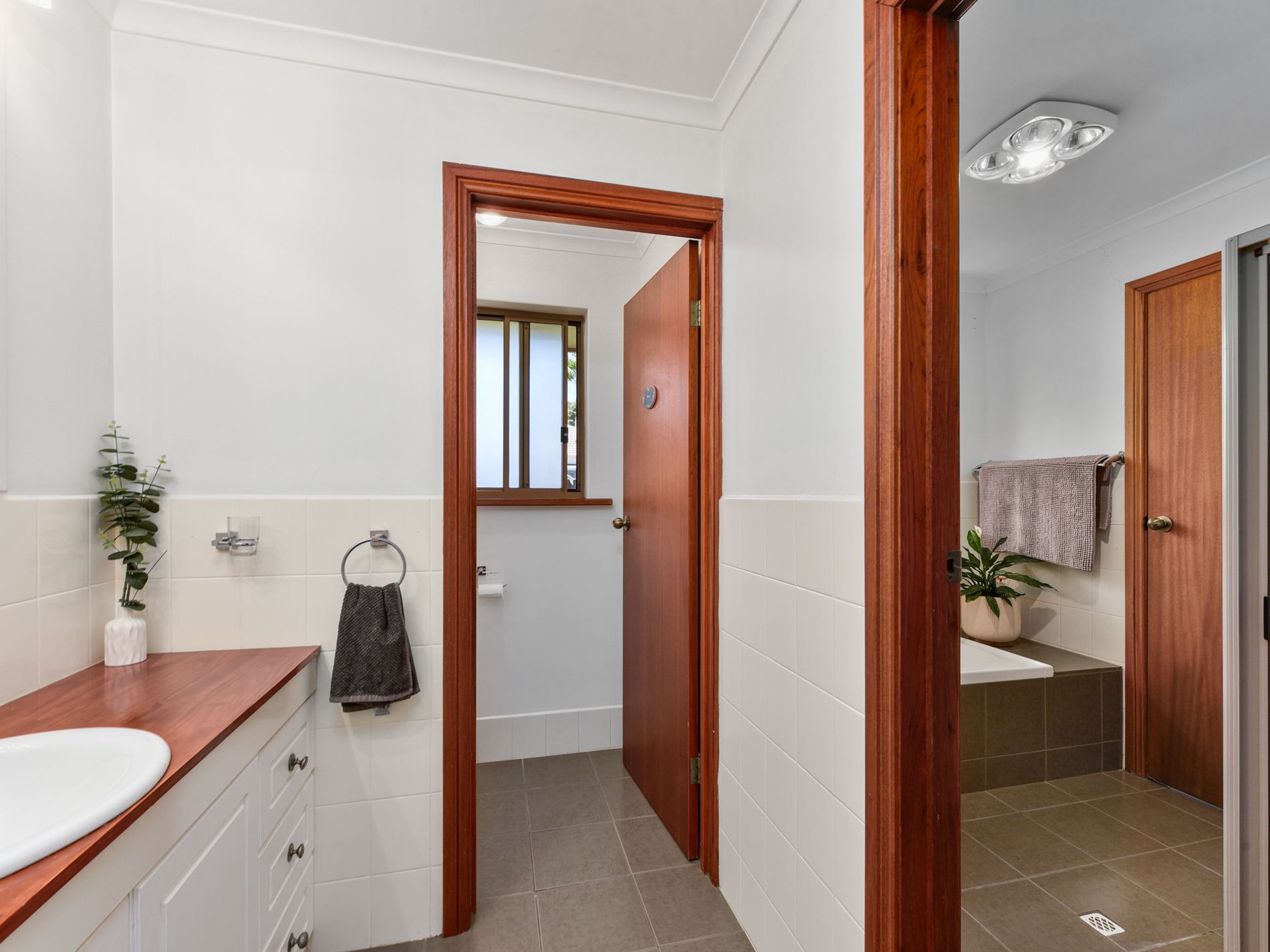 The home comprises three carpeted bedrooms. The main bedroom features a bay window, walk-in robe, and direct access to the main bathroom. Bedrooms two and three include built-in robes and blinds. The bathroom offers both a separate bath and shower. A separate powder room with vanity and a separate toilet are located nearby for added convenience. Additional storage is provided with a hallway linen press, while the rear laundry is tiled and includes a built-in linen cupboard.