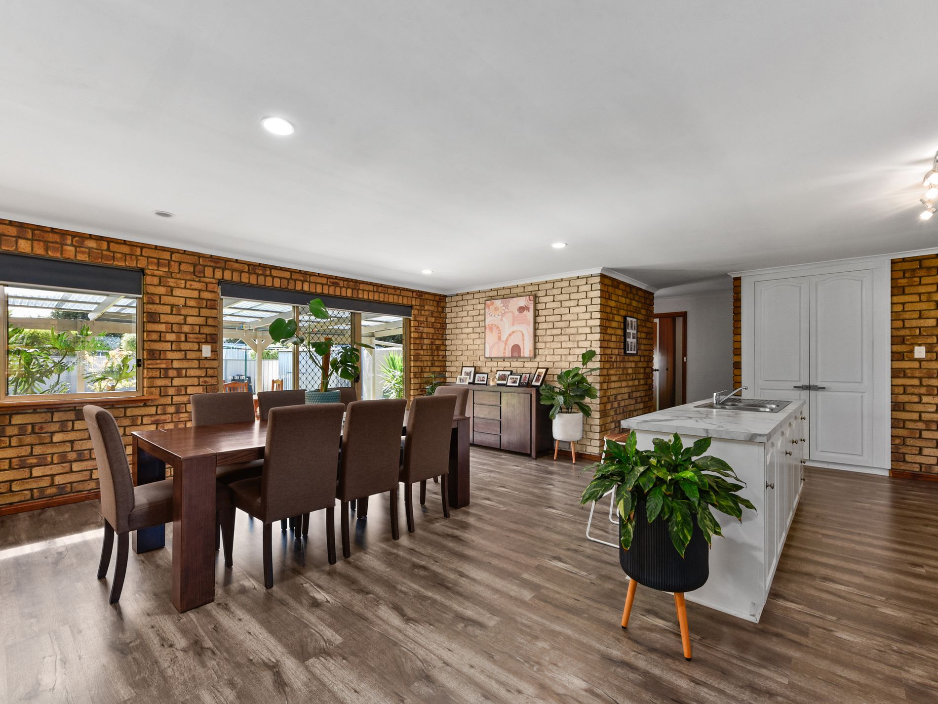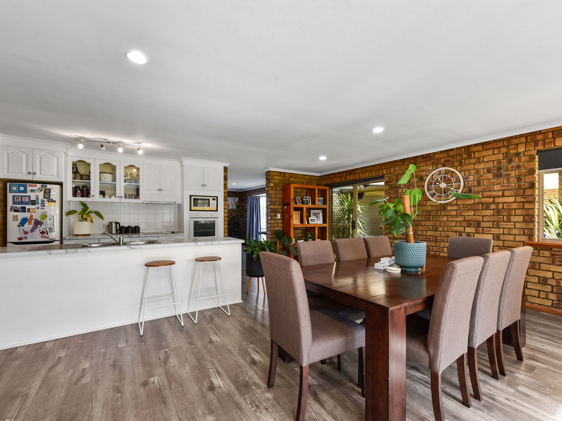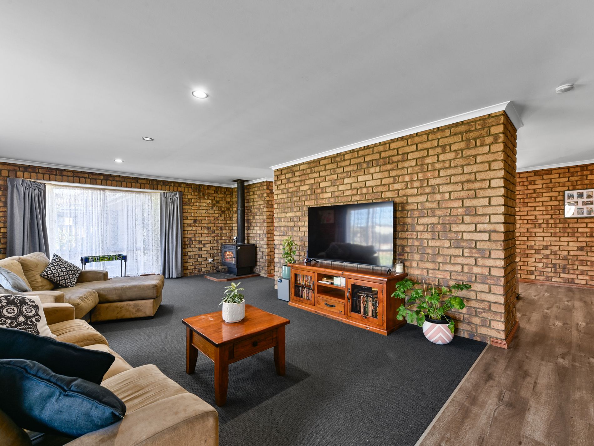 Inside, a spacious formal lounge greets you upon entry, complete with carpet, curtains, and a newly installed slow combustion wood heater & reverse cycle heating and cooling that provide warmth throughout the home during the cooler months. Timber-look vinyl flooring leads through to the open plan living area, where the kitchen, meals, and family zones are seamlessly integrated. This light-filled space connects effortlessly to the outdoor entertaining area via a glass sliding door, while large windows invite in abundant natural light. The well-equipped kitchen includes electric cooking, a rangehood, double sink, and modern benchtops that add a stylish touch.