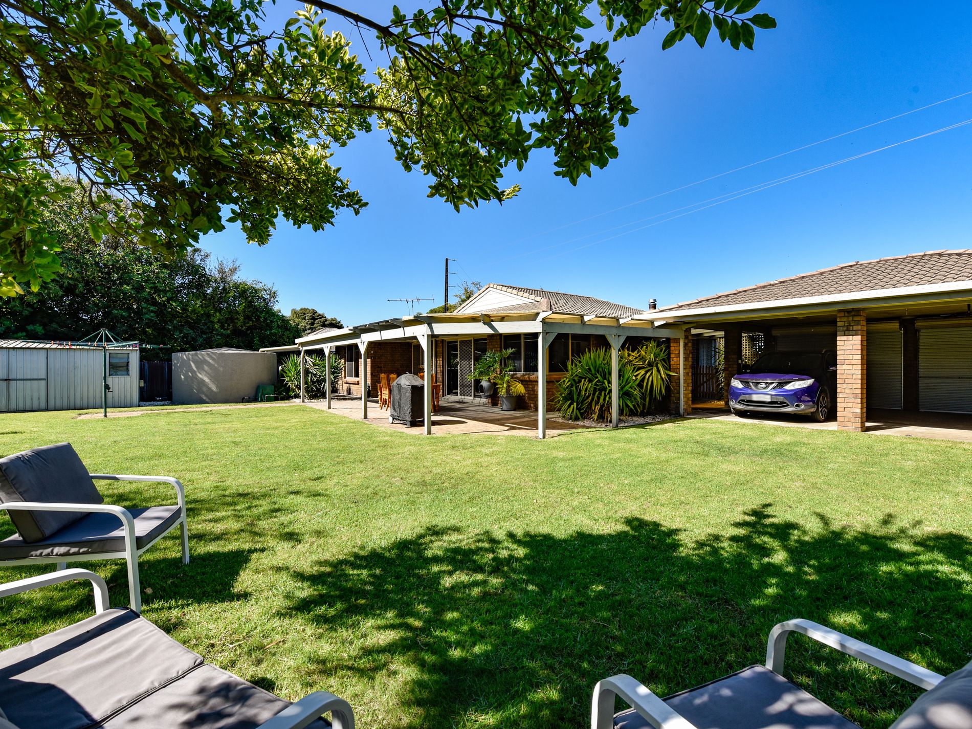 Outside, the property continues to impress with a double carport featuring one electric roller door for secure and convenient access. A paved pergola extends along the rear and side of the home, creating an ideal setting for entertaining, whether hosting larger gatherings or relaxed get-togethers. The fully enclosed backyard is low maintenance, offering neat garden beds, lawn, a garden shed, and a 5,000-gallon rainwater tank plumbed to the house. The property also benefits from both mains water and bore water for garden use.