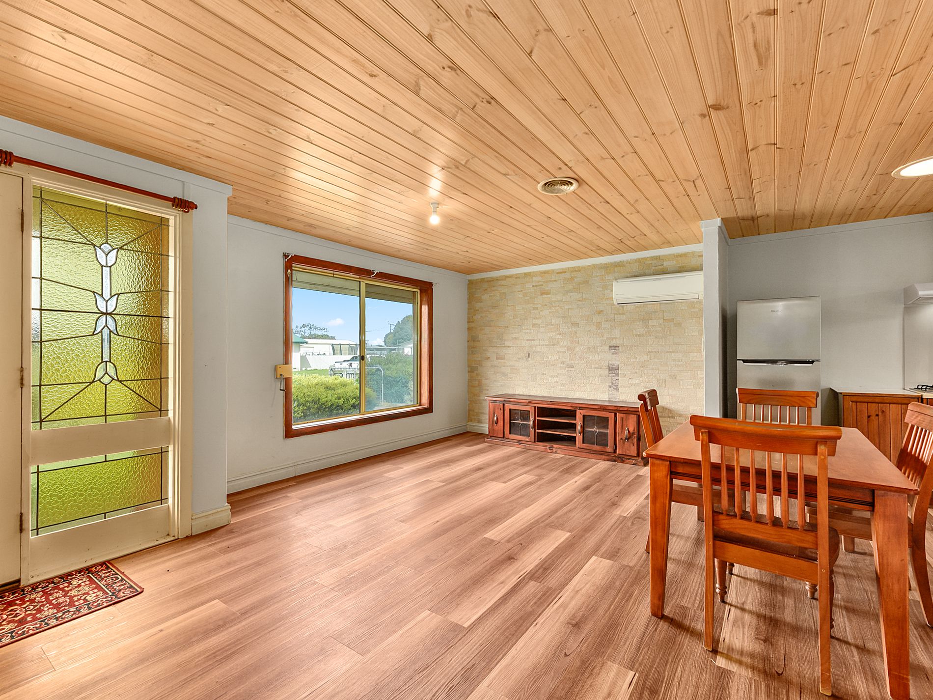 The heart of the home is a light-filled open dining and kitchen area, complete with stylish timber-look flooring and a feature wall that adds warmth and character. A split system ensures year-round comfort, while roller shutters to the front and rear bedrooms provide added privacy and peace of mind.