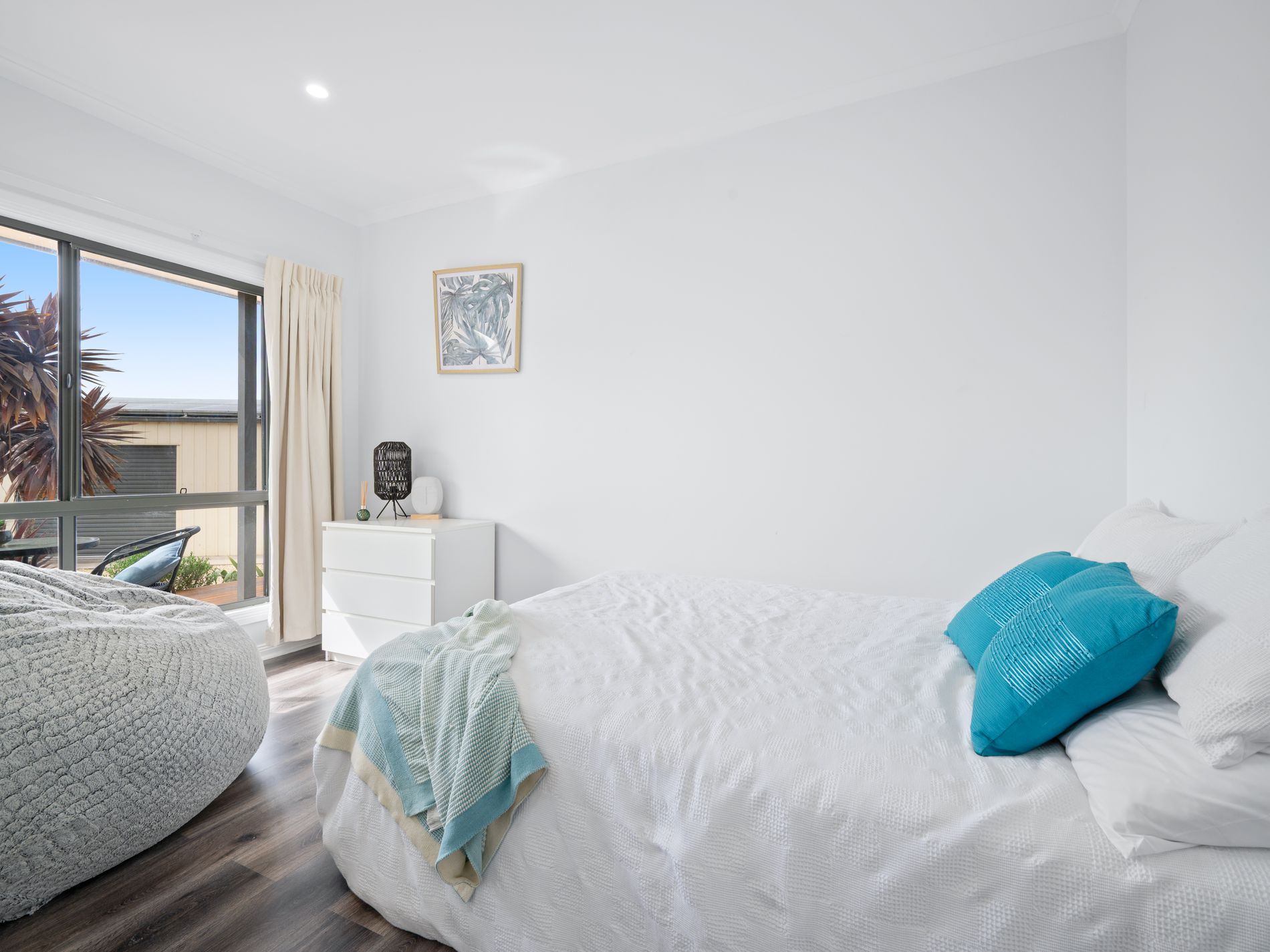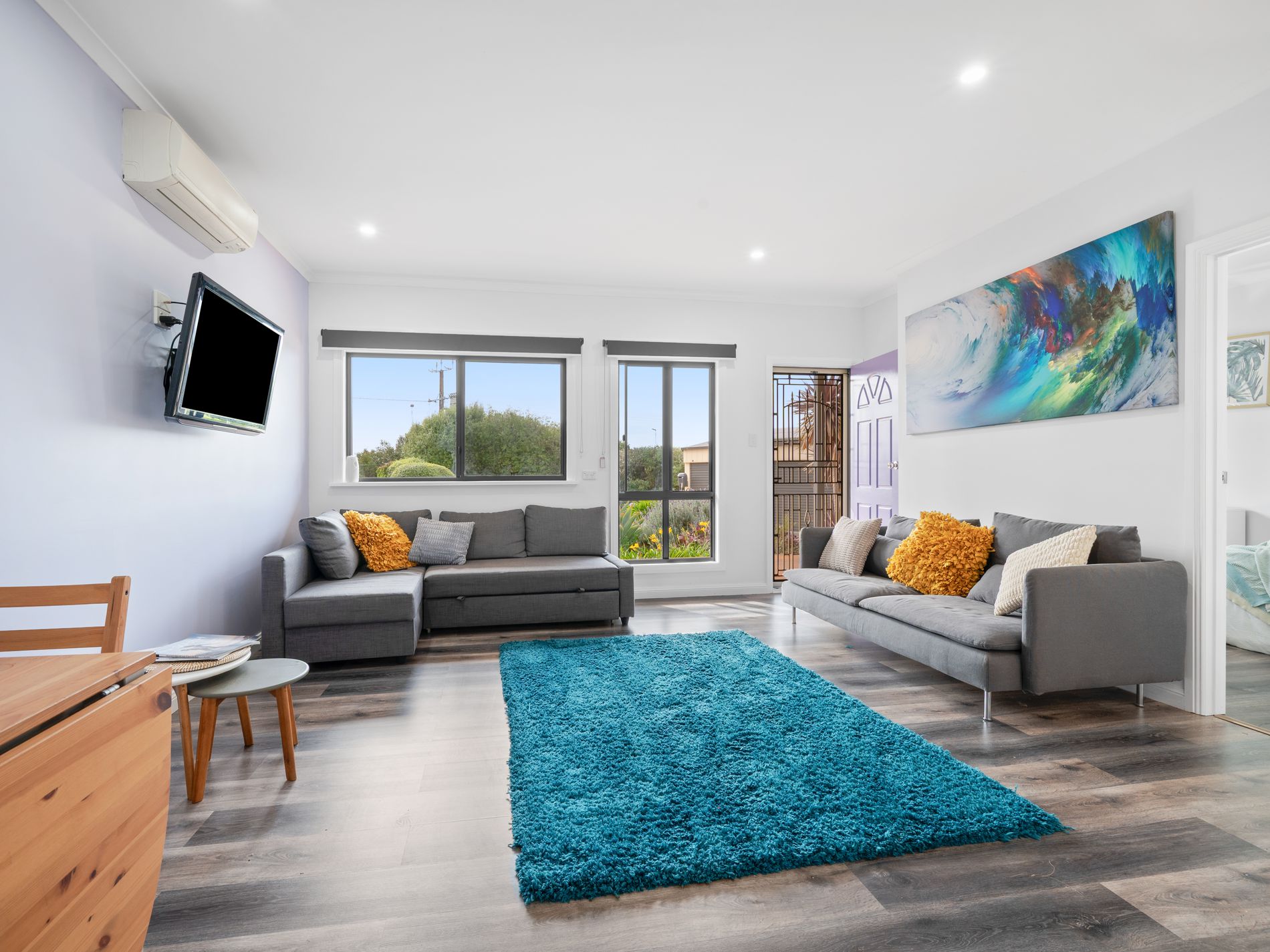 The adjoining granny flat has also been thoughtfully renovated, mirroring the main home’s quality finishes with updated flooring and stylish cabinetry in the kitchenette. A split system ensures comfort throughout the seasons, while two bedrooms—one with built-in robes—provide flexibility for guests or longer-term living. The bathroom is bright and functional, featuring a walk-in corner shower.