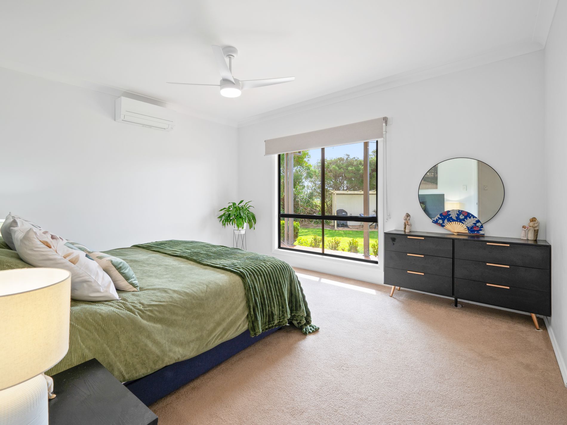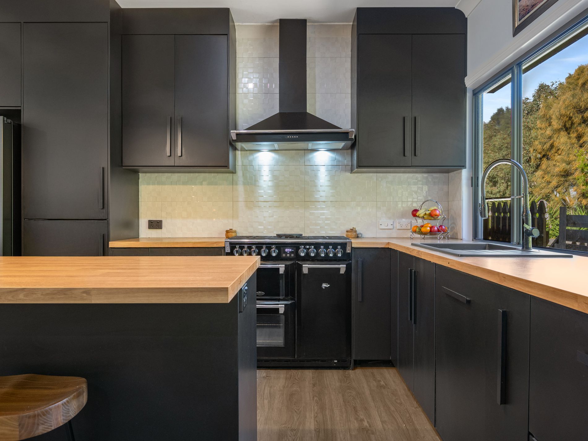 Inside the main home, you’re welcomed by an impressive open-plan kitchen, dining, and living area that showcases a tasteful modern renovation. Sleek matte black cabinetry is paired with warm timber benchtops, while a standout imported Belling oven with gas cooktop and an integrated Bosch dishwasher enhance both style and functionality. A butler’s pantry combined with the laundry provides generous storage and practical workspace, all finished with consistent high-quality cabinetry. The separate carpeted lounge is filled with natural light thanks to large front-facing bay-style windows and is kept comfortable year-round with a reverse cycle split system.