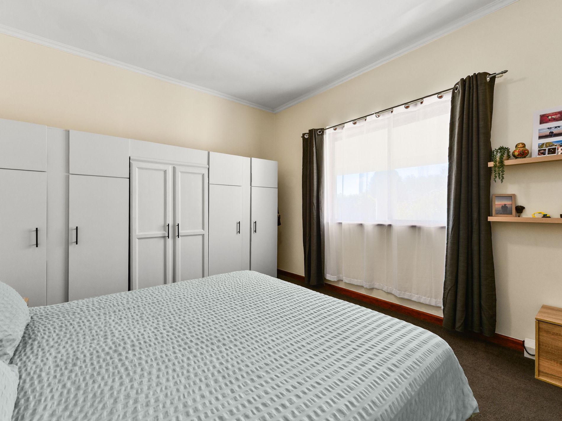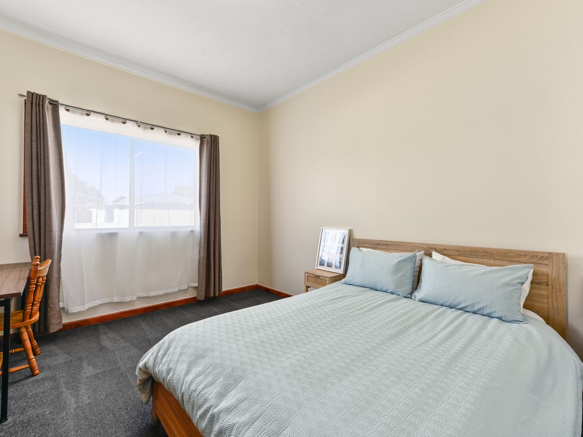 Moving through the home, Bedroom one is located just off the main living area, offering a comfortable and private retreat. Bedrooms two and three are both carpeted and located near the central tiled bathroom. Centrally positioned, the tiled bathroom includes a shower and vanity, servicing the home with ease.