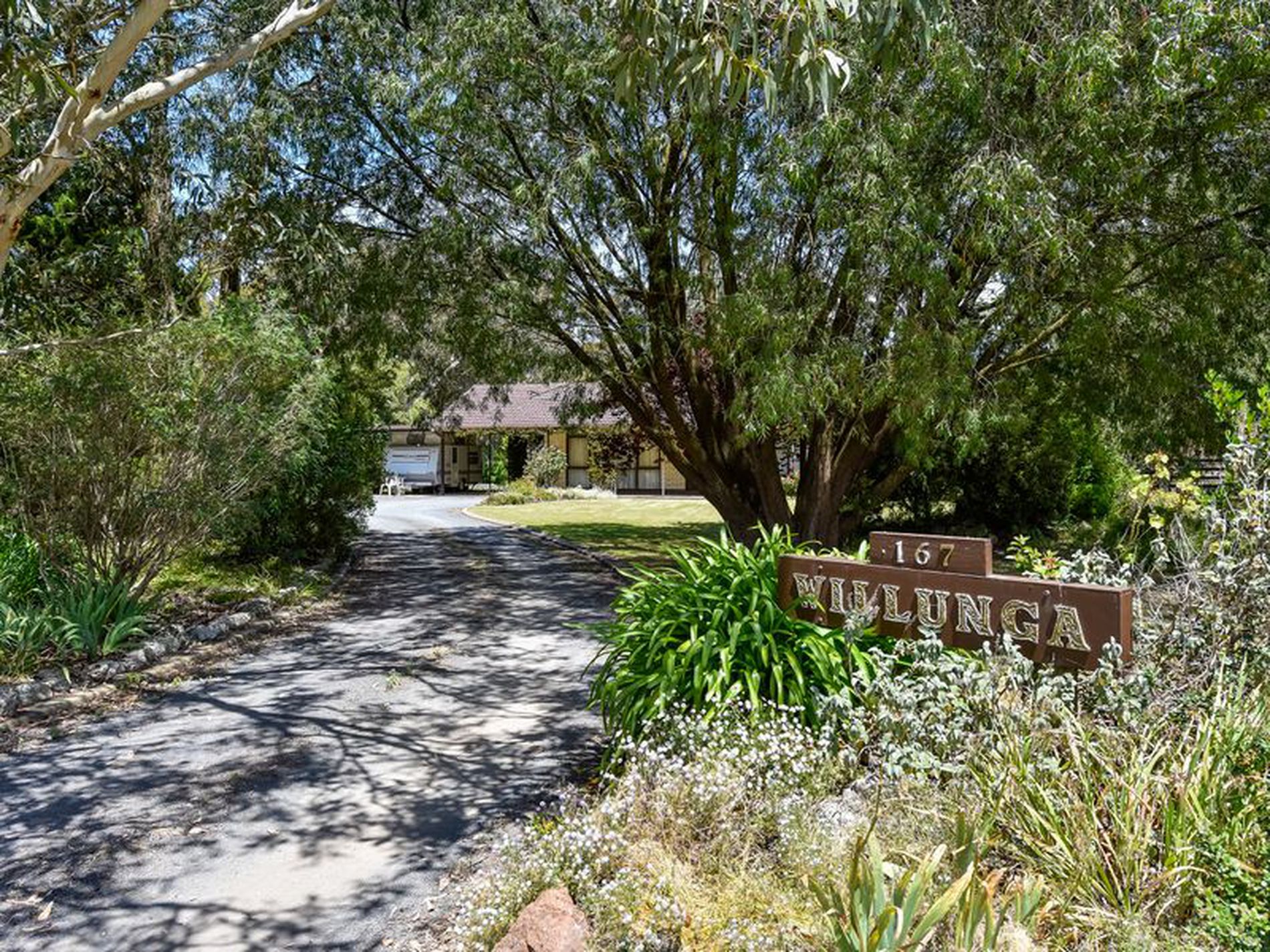 Out side the established garden is stunning. The open expanses of lawn are lined with sweeping garden beds of established trees, flowering plants and groundcovers, Making the setting very quiet and private.