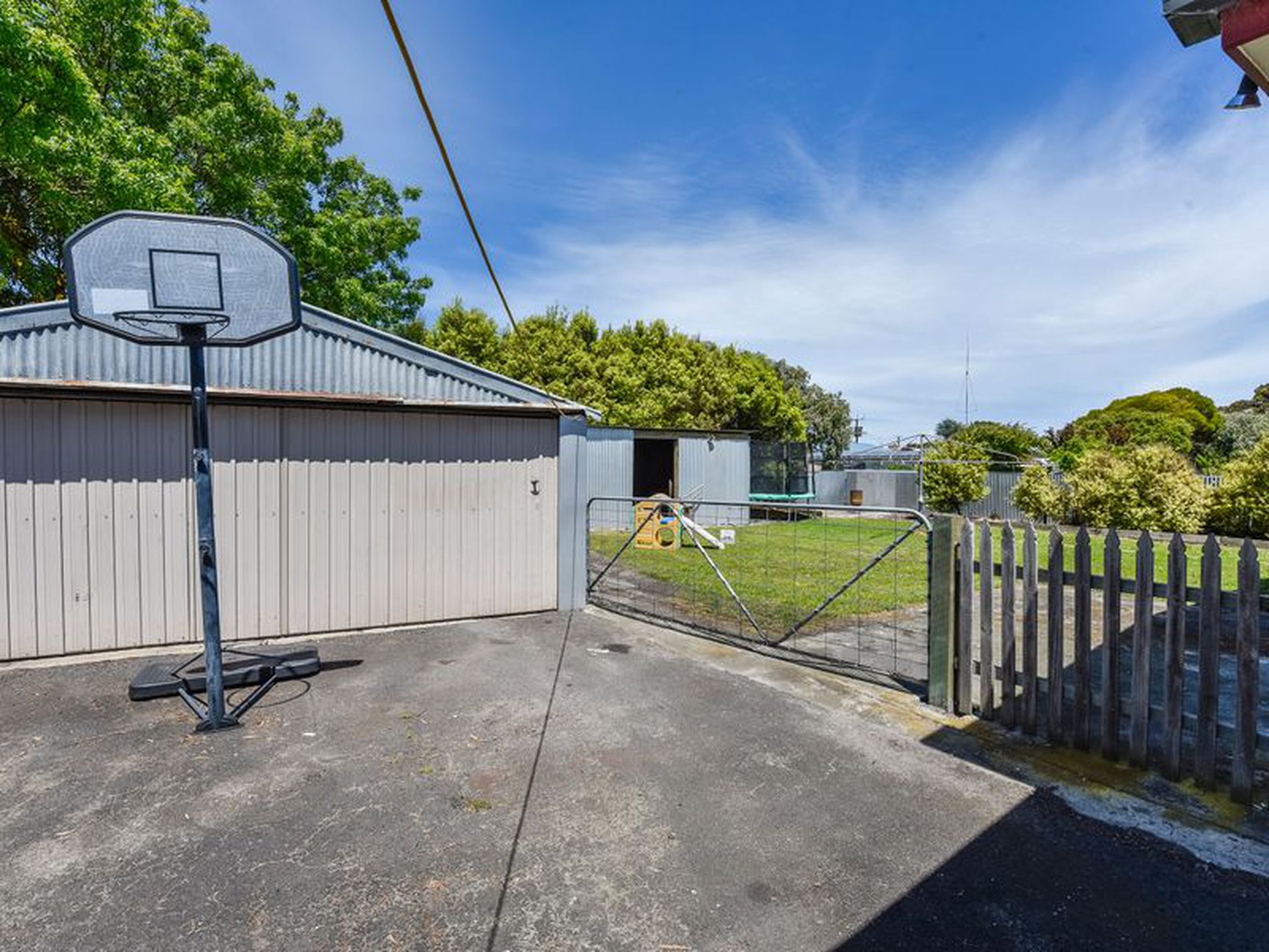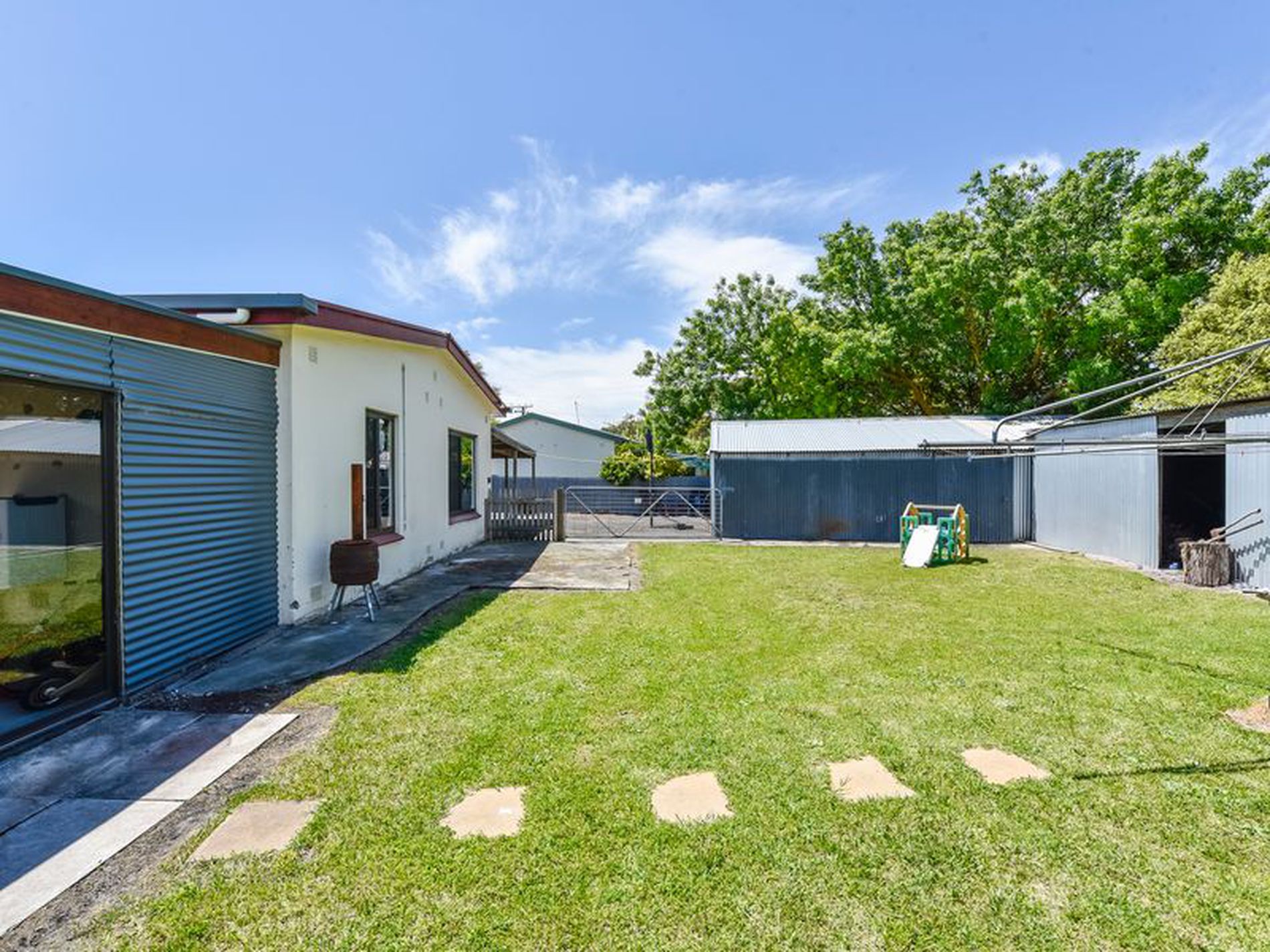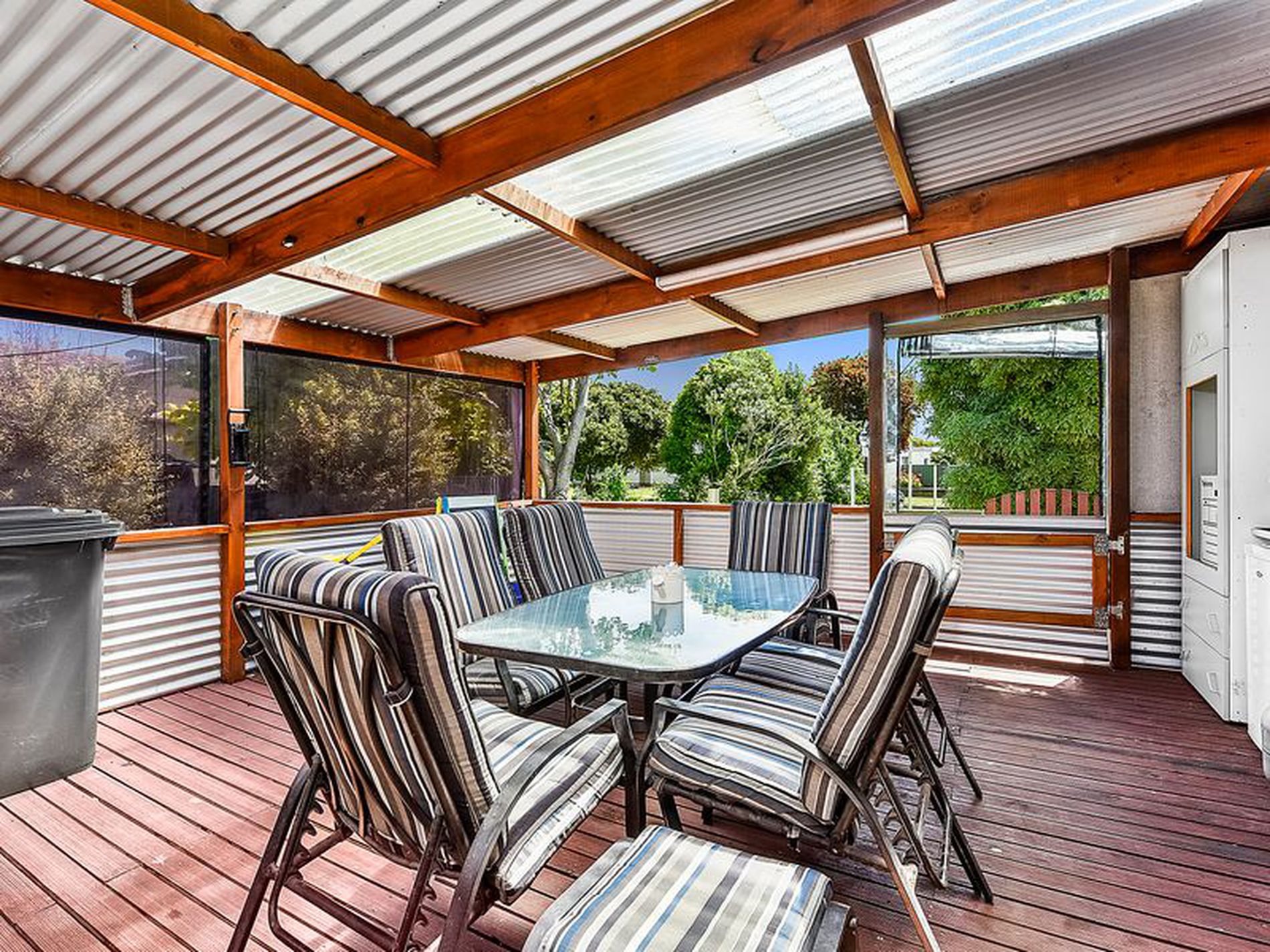 Walk out of the rear door into the huge fully enclosed outdoor entertaining area. The large decked area has roll down blinds and an outside kitchen. Step down to the cemented area with Galvanised iron walls a monster of a wood heater and sliding doors out to the fully enclosed rear yard with large wood shed.