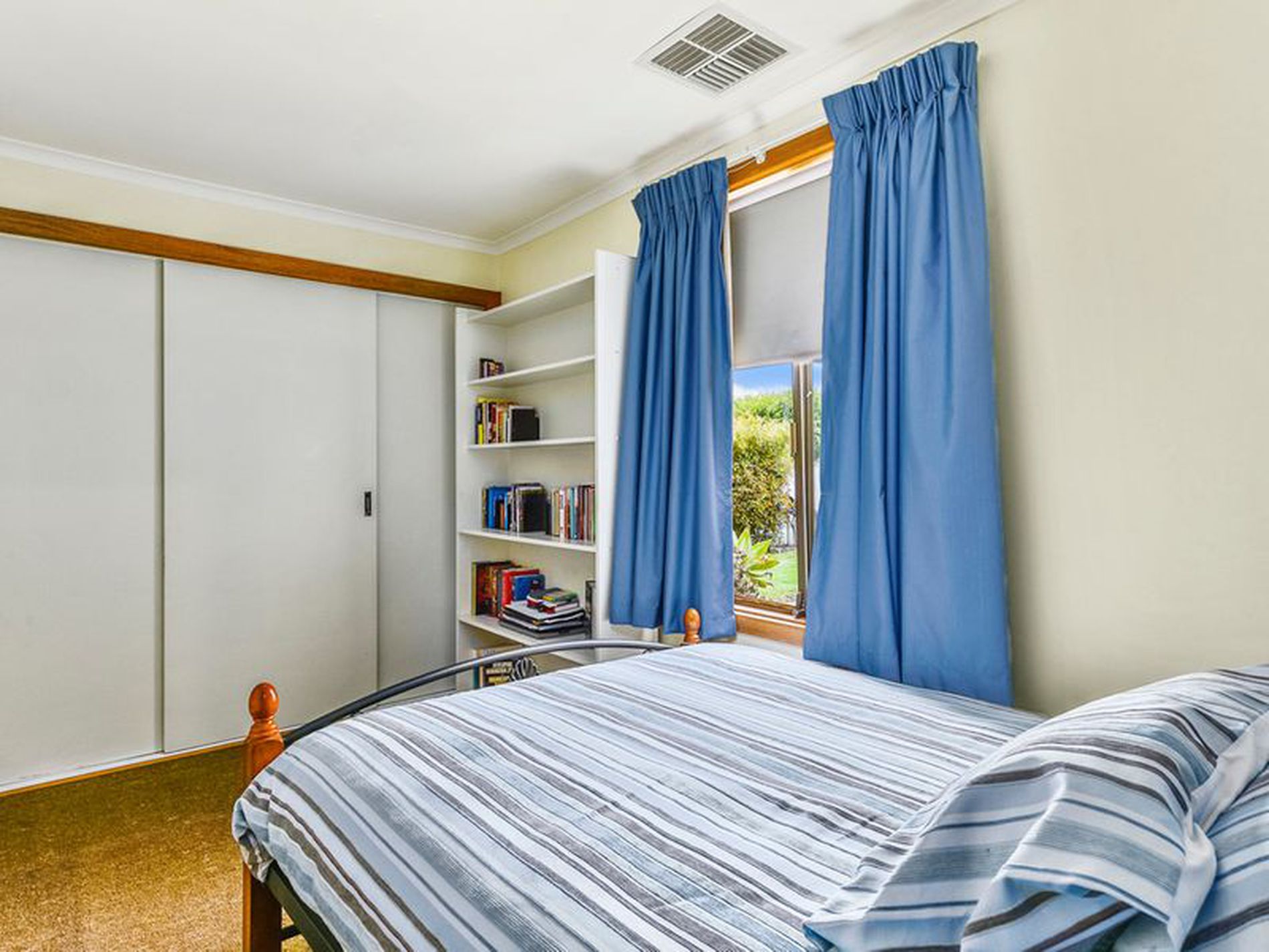 The main Bedroom is large and carpeted, with built-ins and easy access to the bathroom.