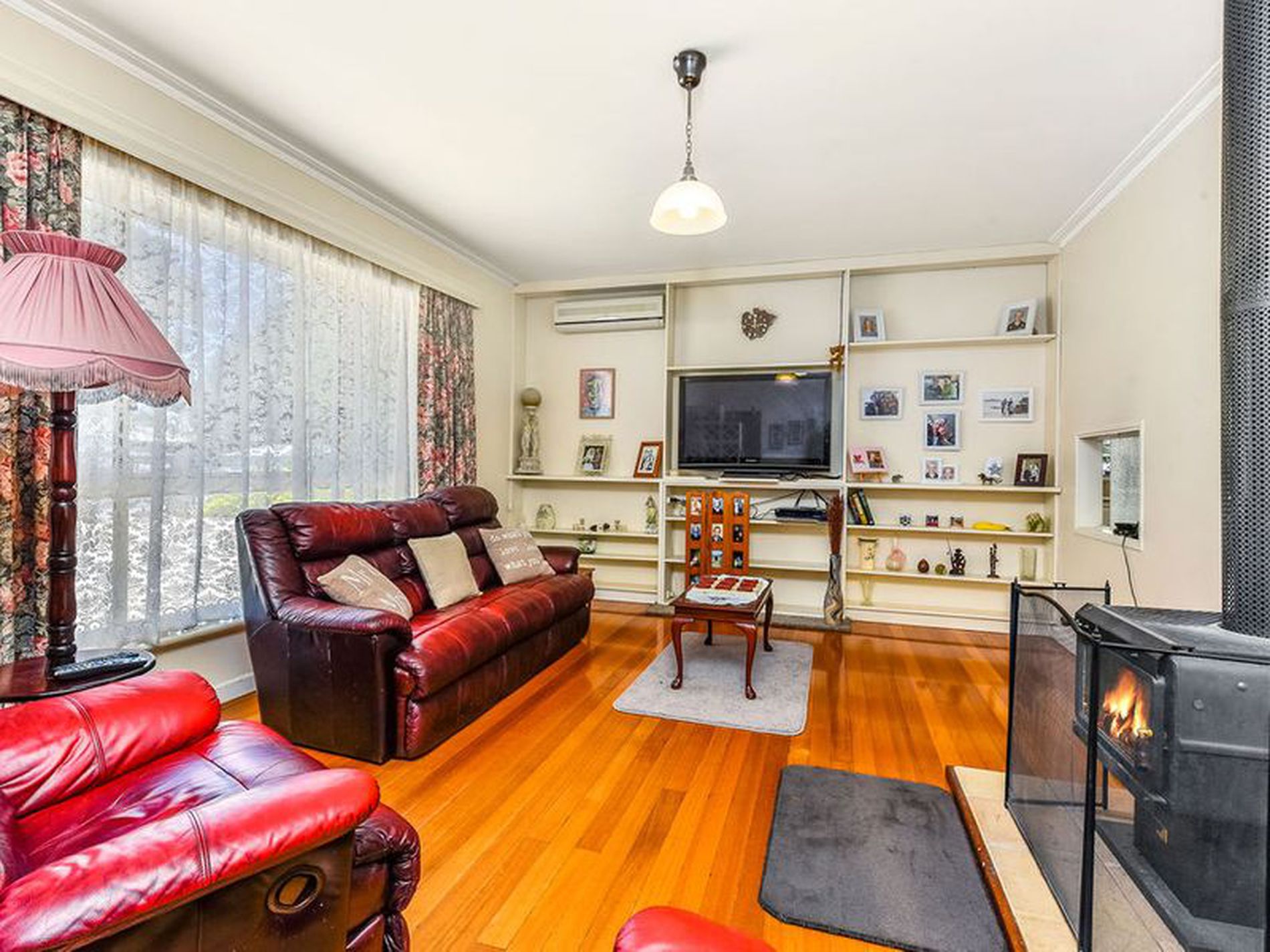 Tasmanian oak flooring entrance, lounge and passage. The lounge is quite open and spacious with built-in shelving along end wall, Slow Combustion and Reverse Cycle wall unit.