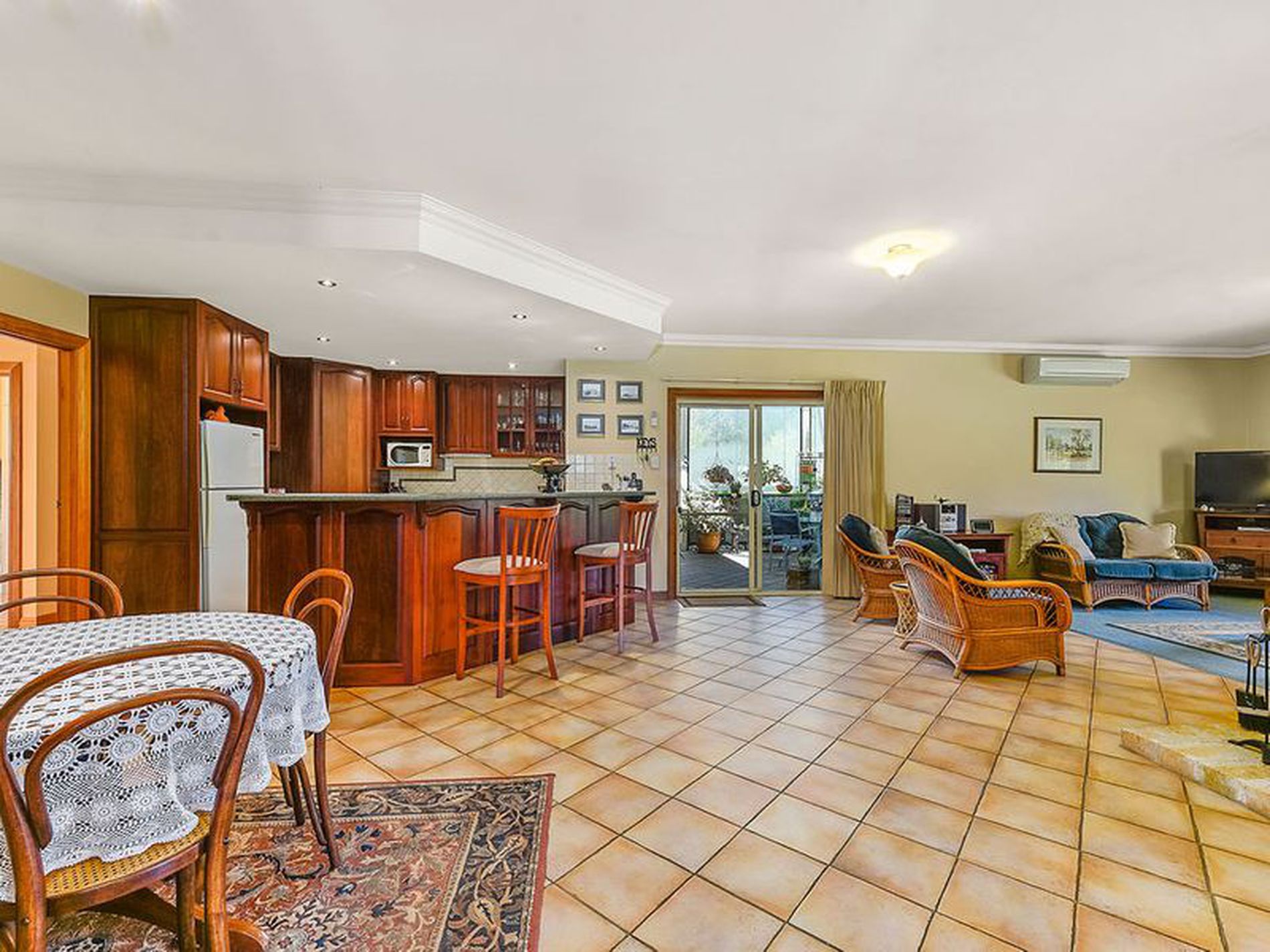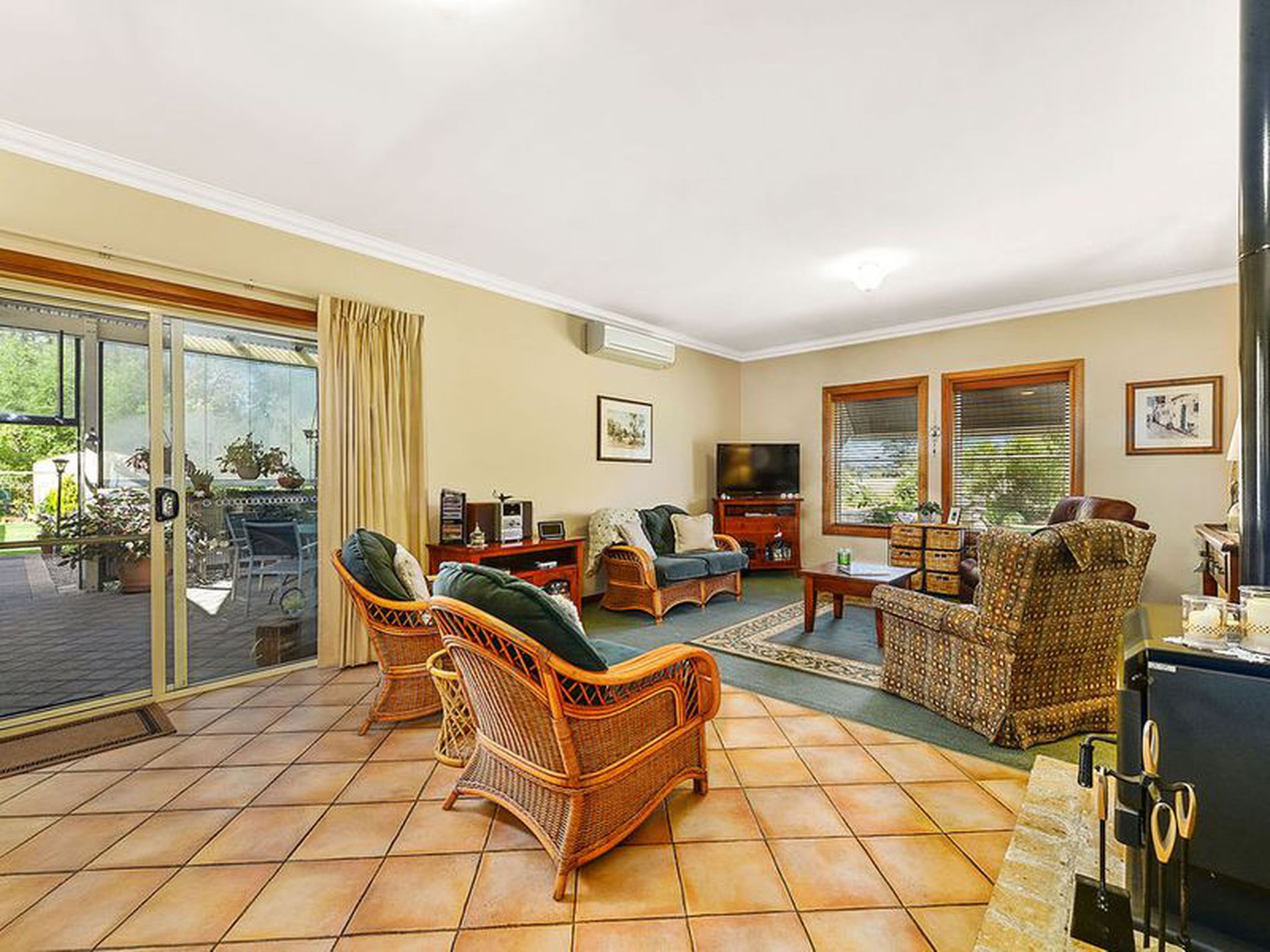 Open family living offers comfort all year round with a Split system air conditioner and slow combustion fire.
