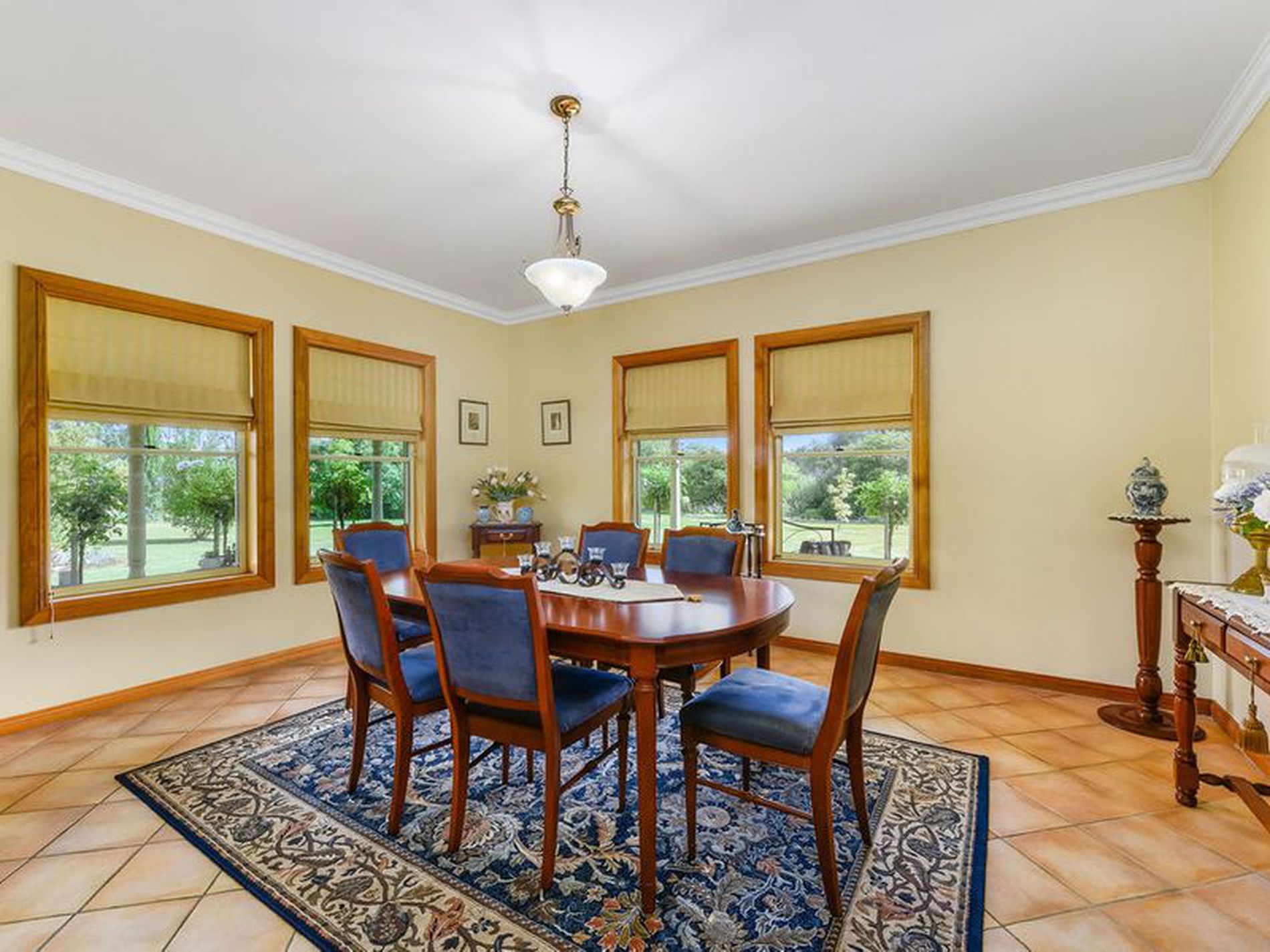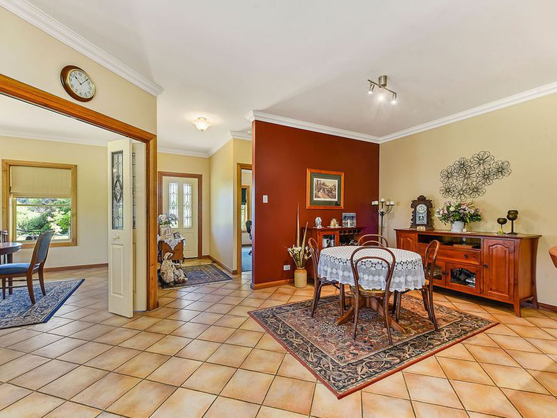 Bulkhead and downlights frame the open plan kitchen with Electric H/P's and underbench oven, double sink and corner pantry. A return breakfast bar and casual dining area take in the garden views. Stained glass concertina doors are a feature in the dining room which flows through to the formal living area.