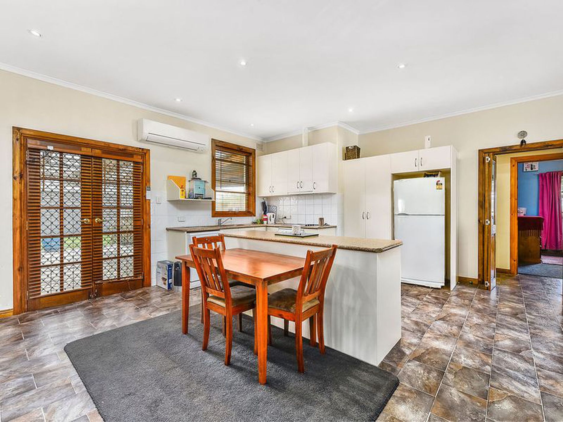 The updated kitchen contains an island bench, electric cooking, dishwasher, overhead cupboards and pantry.