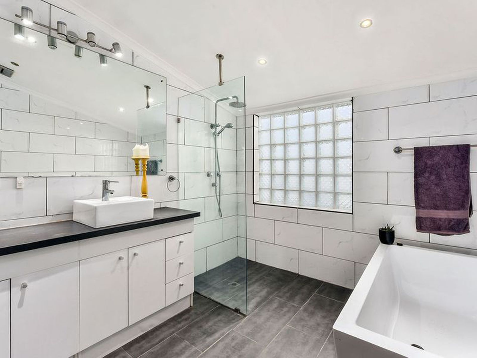 Fully renovated bathroom with deep bath, open spacious shower with glass brick feature. Vanity with spotlight bar. Laundry and separate adjacent toilet located next to bathroom.