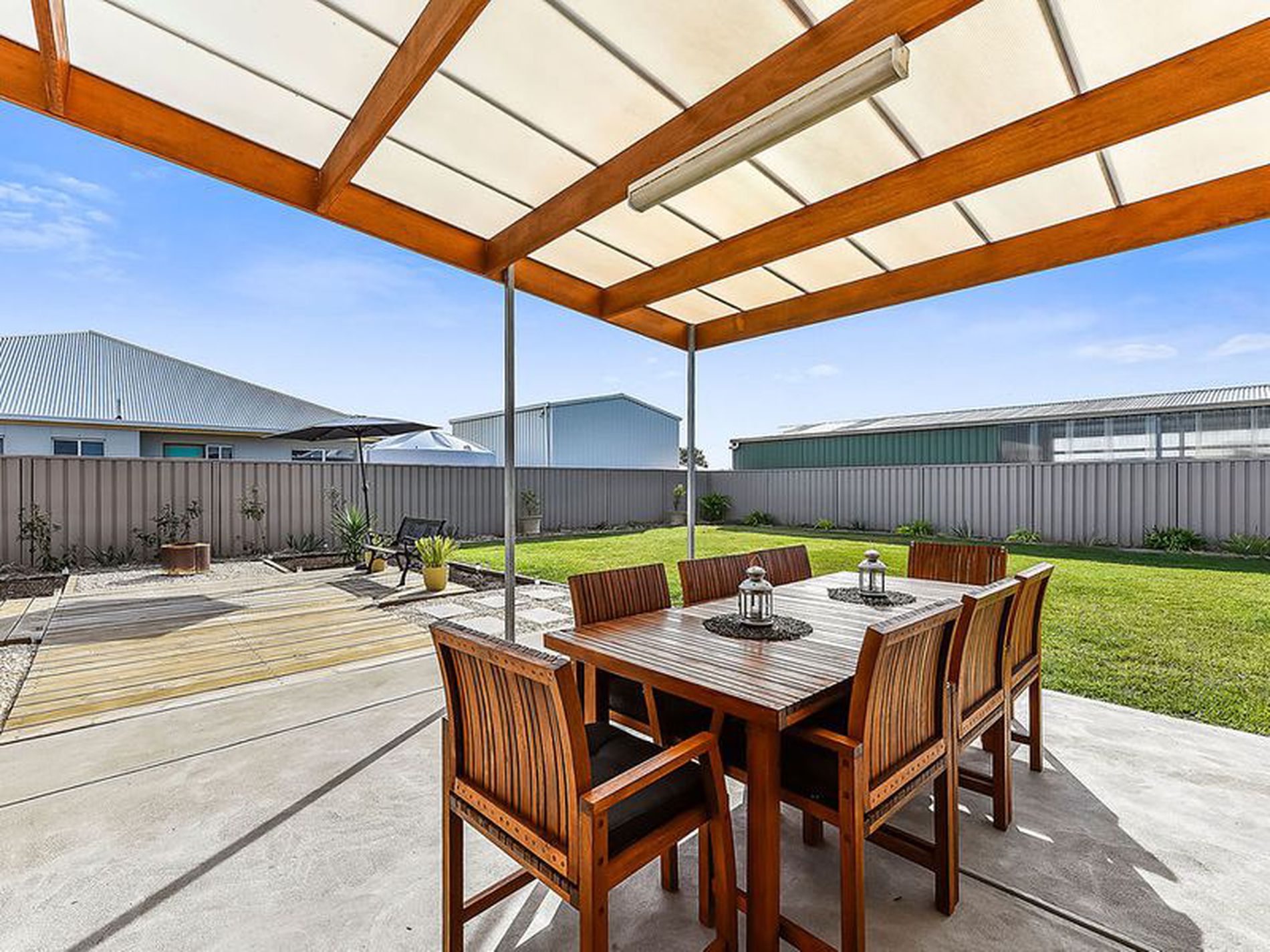 Outside the yard also offers plenty of space for the family and the boys toys or caravan. Access through double gates from the driveway allows you to drive through. There is plenty of lawn and established garden beds with semi automatic watering system as well as a decked area with a fire pit and a Garden shed. The undercover alfresco area has cement floor and power, so entertaining outdoors is definitely covered.