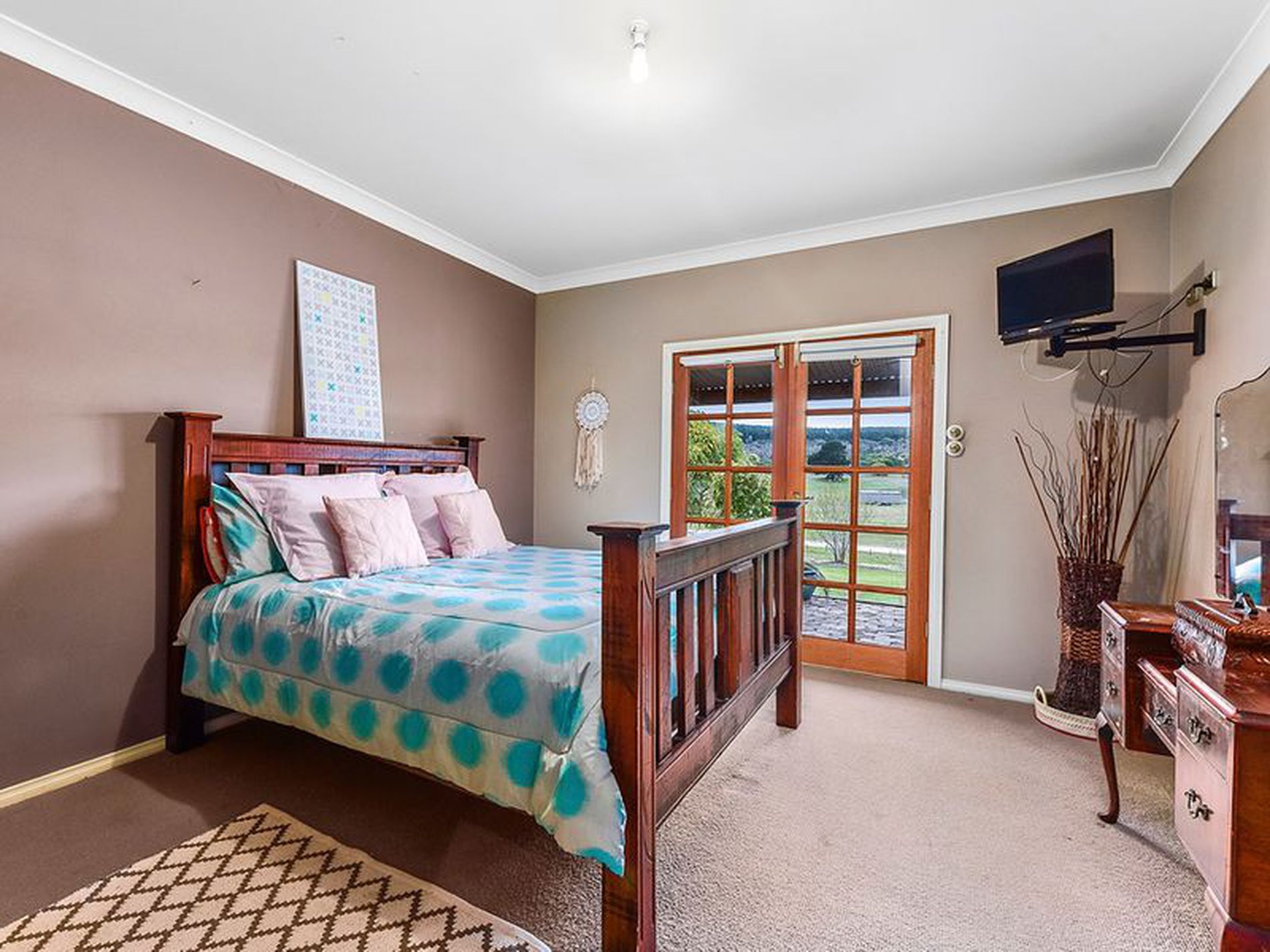 The master bedroom is carpeted and has a walk through wardrobe and ensuite with shower, vanity and toilet and french doors opening onto the verandah with sweeping views across the country side.