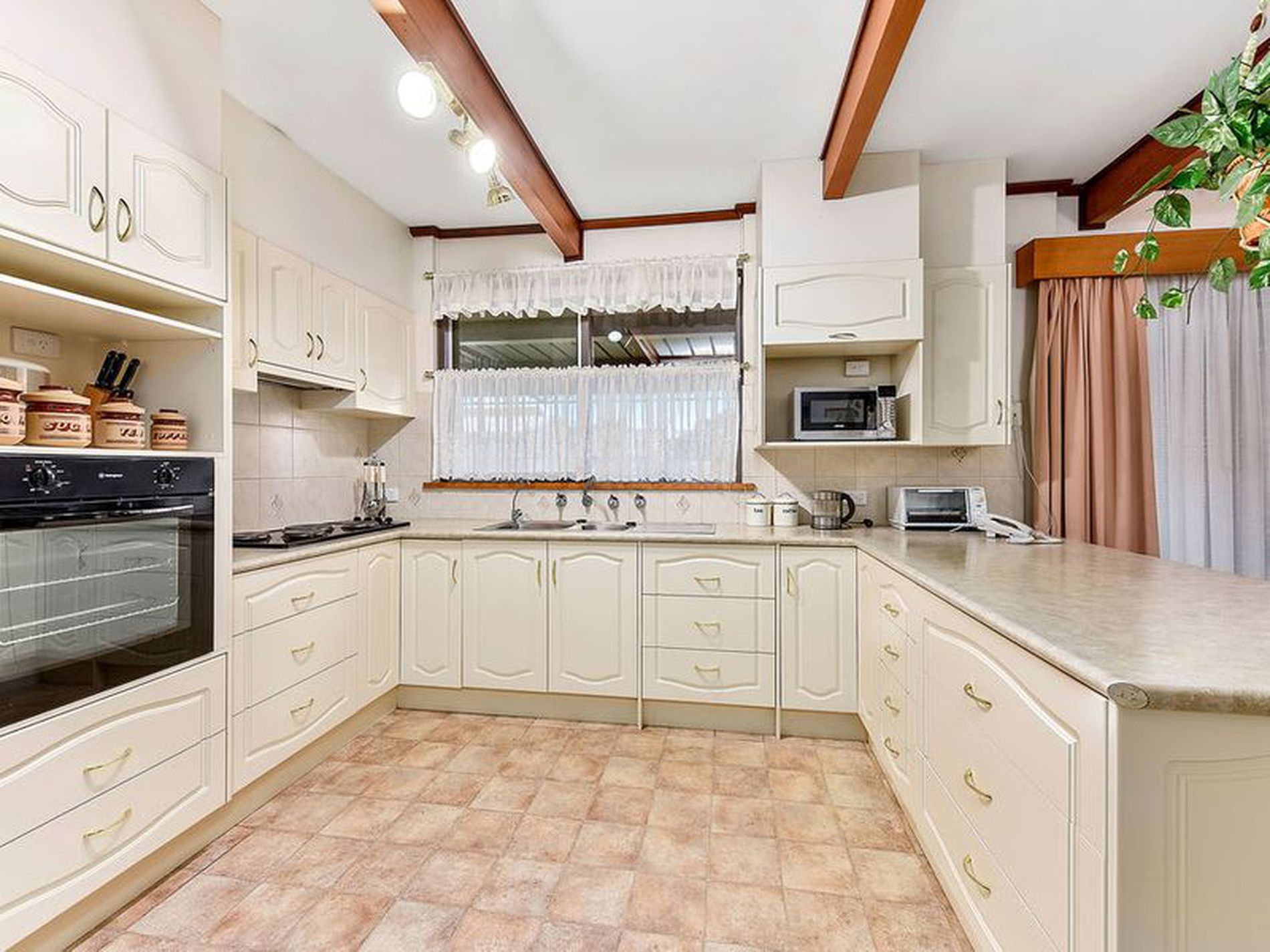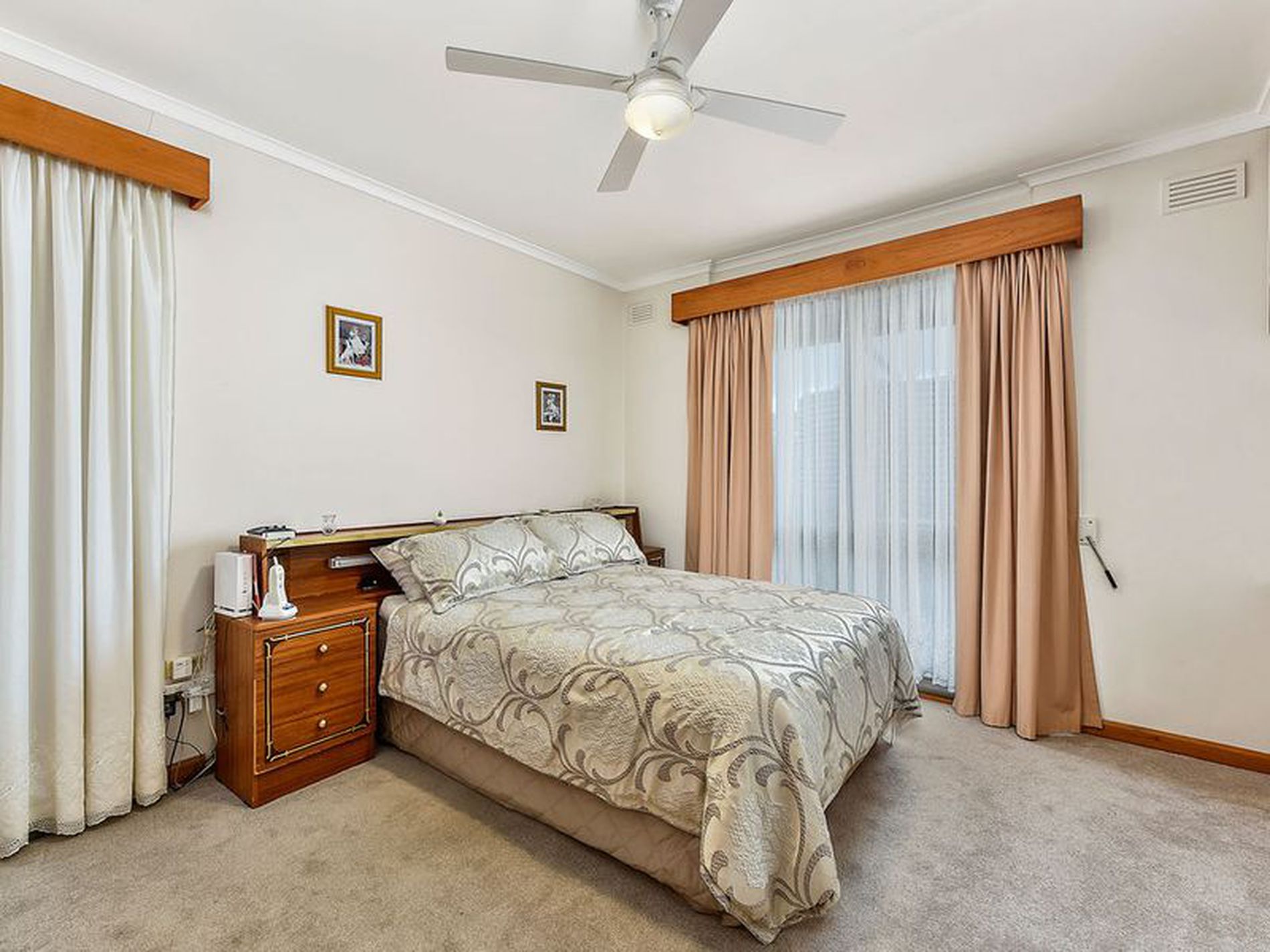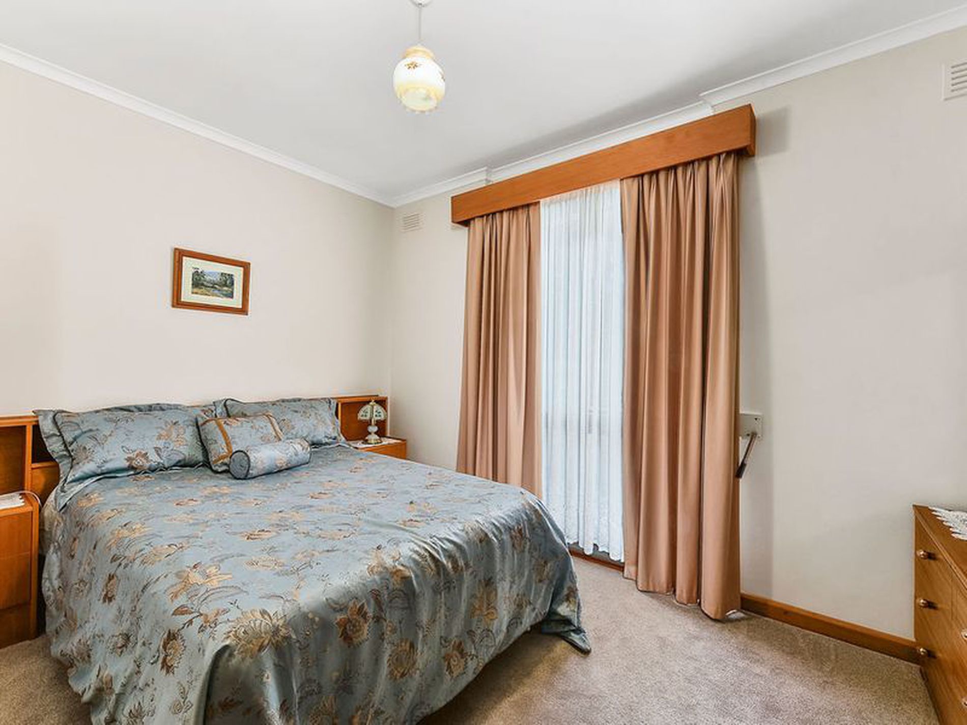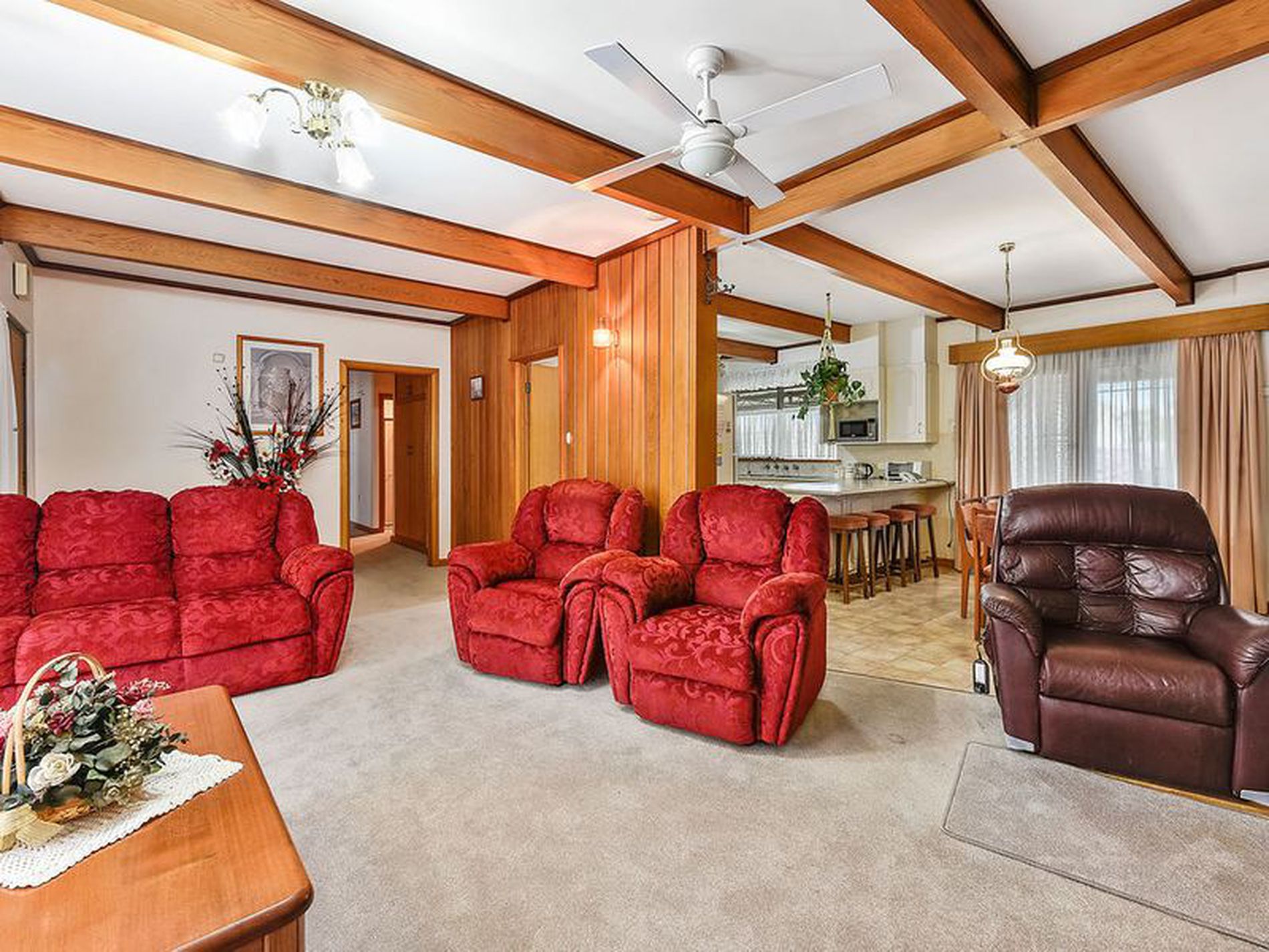 Enter through the front door into the large open plan kitchen, dining, living area. The kitchen has been updated and provides you with ample bench and cupboard space, you have electric cooking, pantry and a double sink. Dining is adjacent and open to the lounge room. There is an external door to the rear pergola off of the dining and reverse cycle air conditioning heats and cools the whole space. The lounge is carpeted with curtains