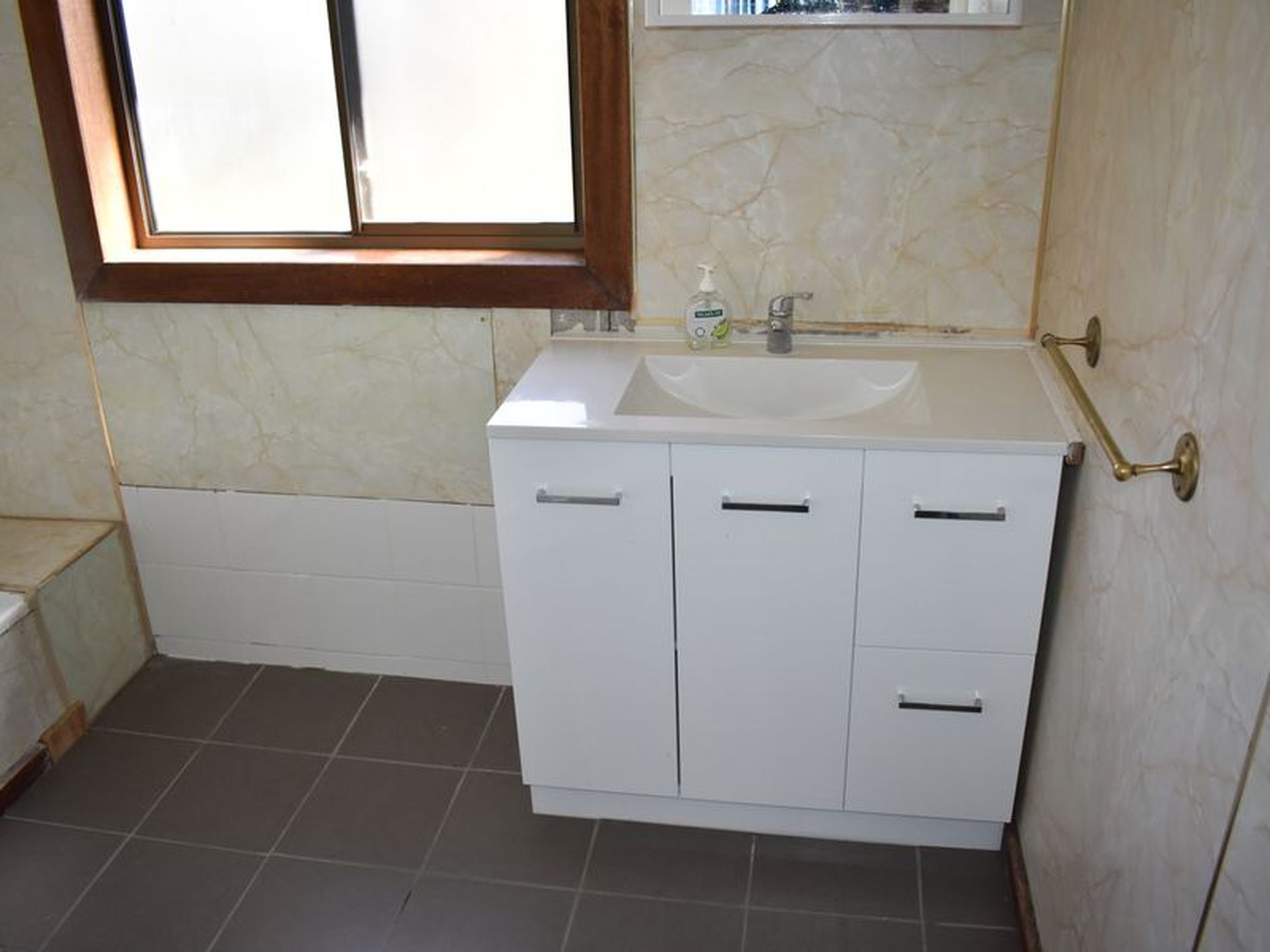 Separate toilet off newly tiled open area laundry. Bathroom has a shower over the bath and new vanity