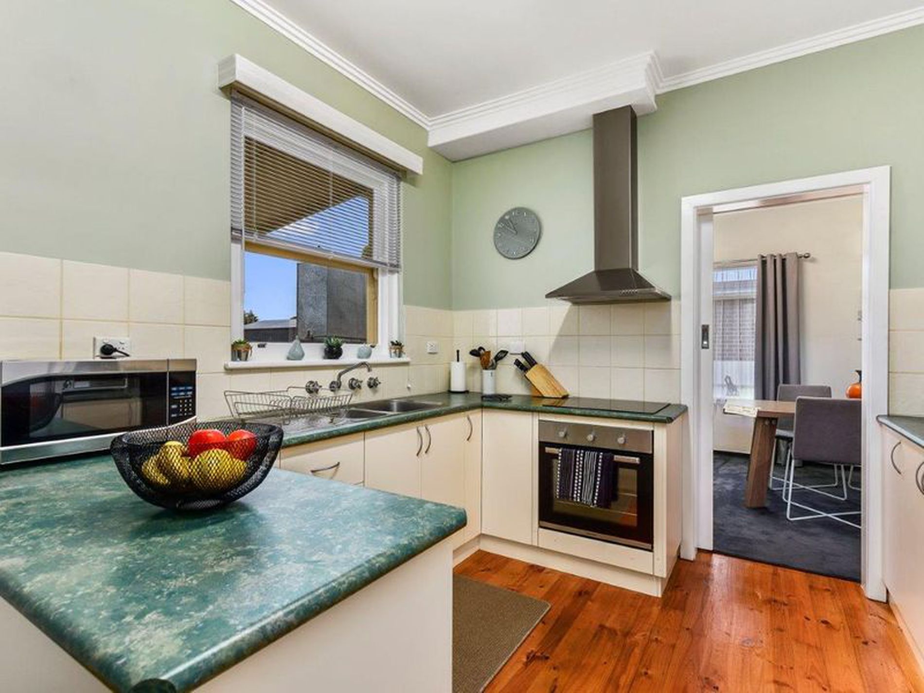 Flows around to the modern Kitchen with Double sink, Electric hotplates, new underbench oven.