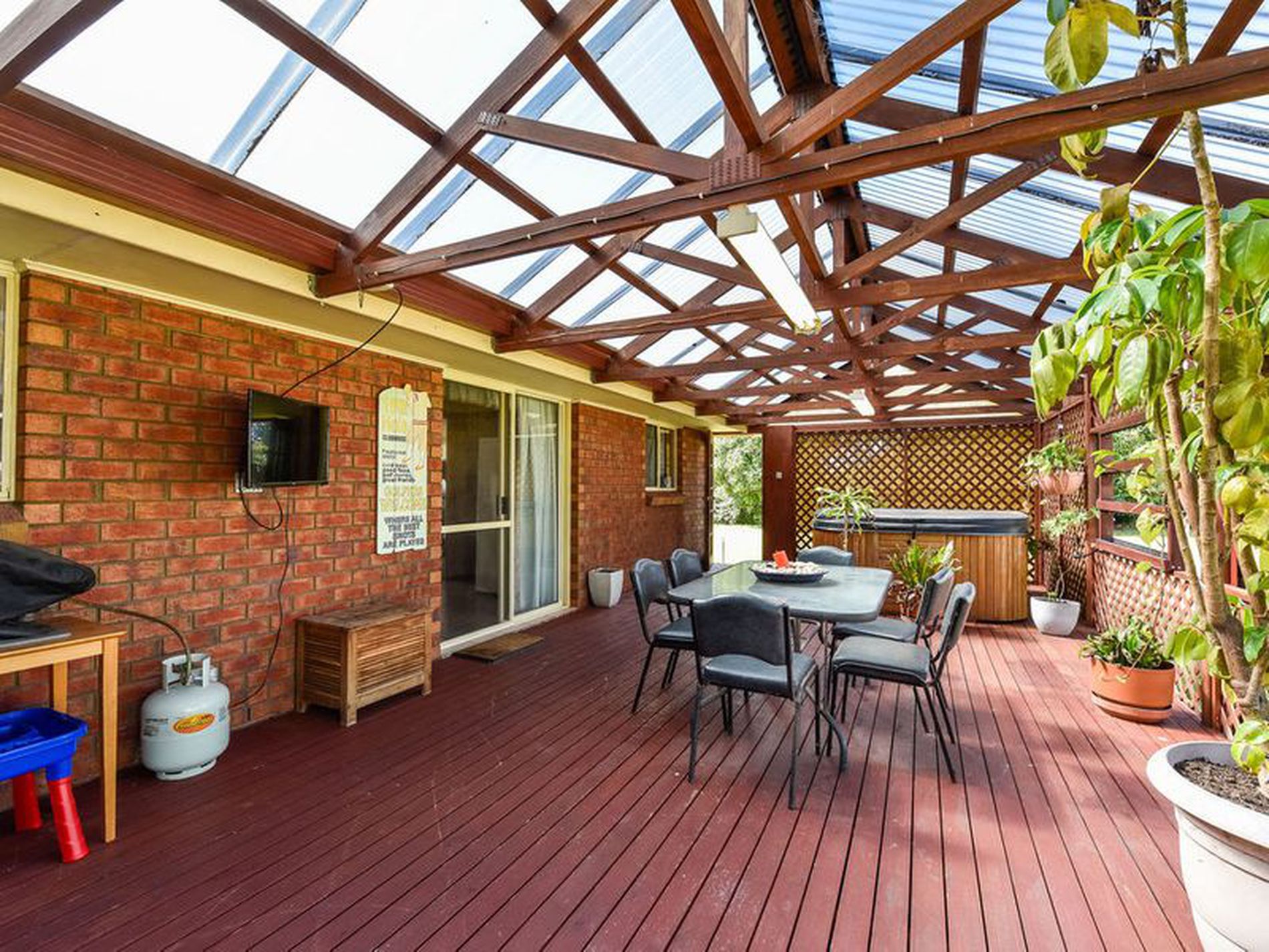 The pergola, with sliding doors off the kitchen and Beltex ziptrak blinds, makes for a good private protected entertaining area