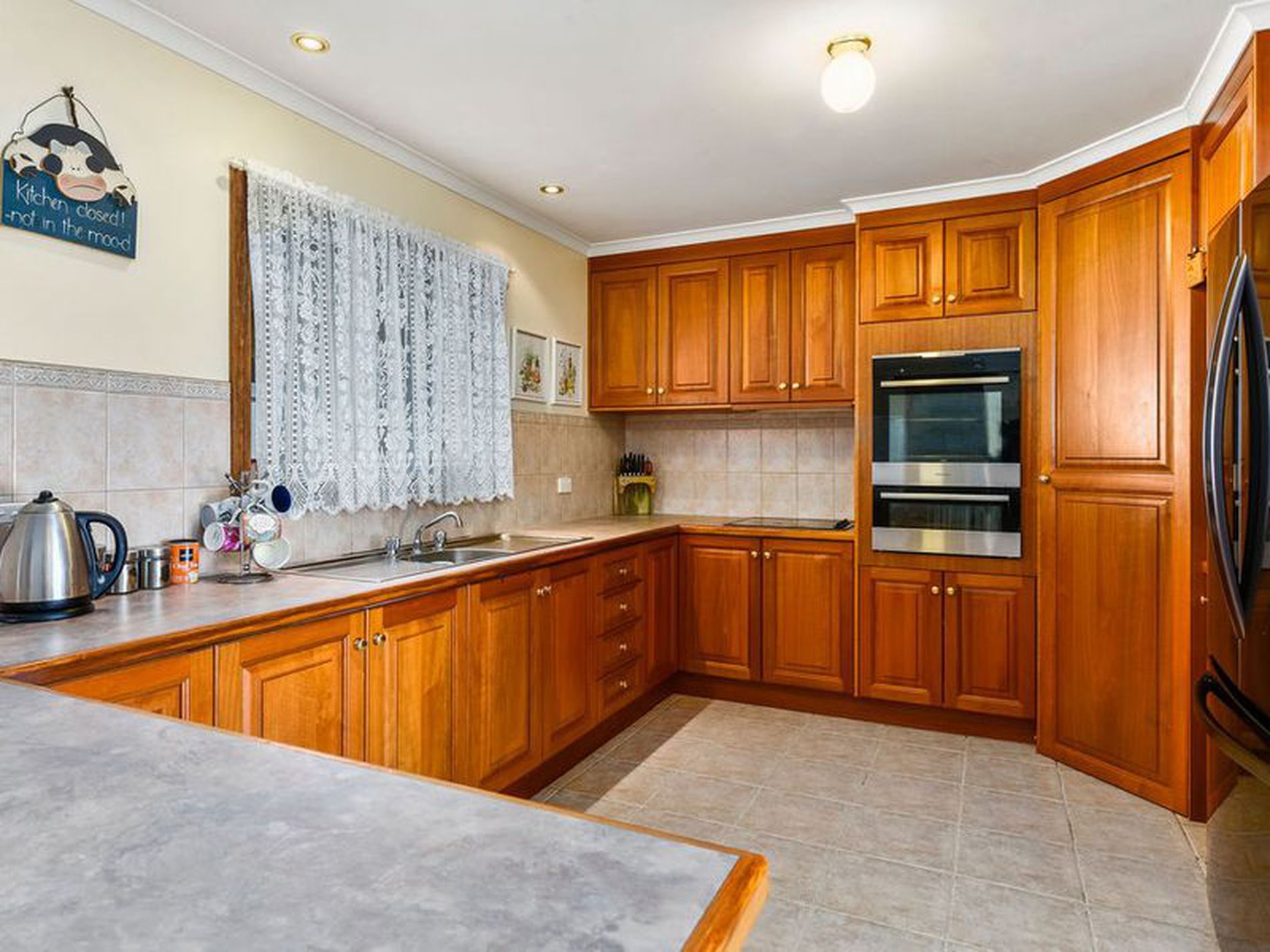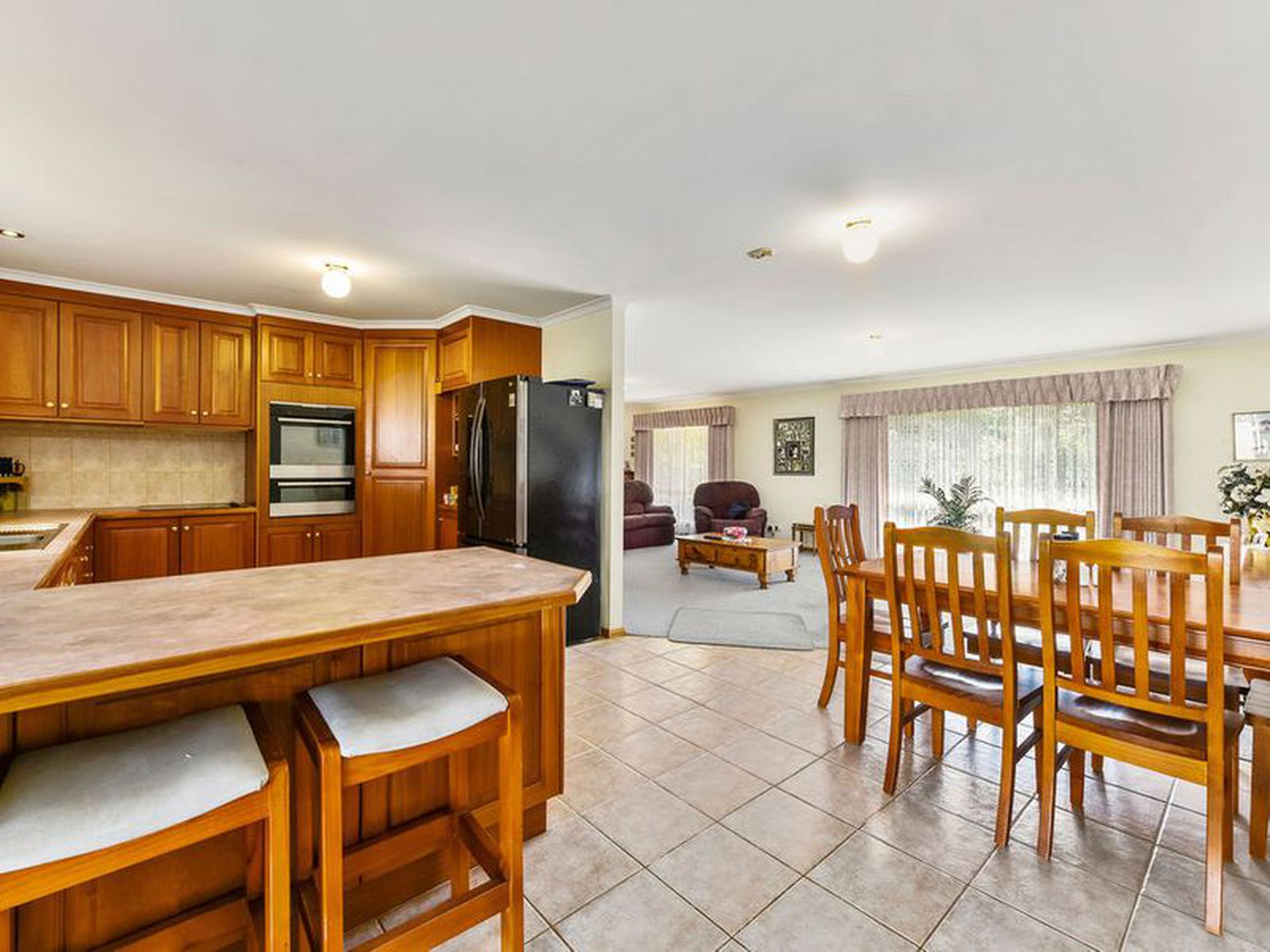 The Kitchen is tiled with timber cabinetry, a corner pantry, electric wall oven and grill, plus a great large storage, pantry or office room off the kitchen. The return breakfast bar and dining table area allows plenty of room to sit and enjoy meals.