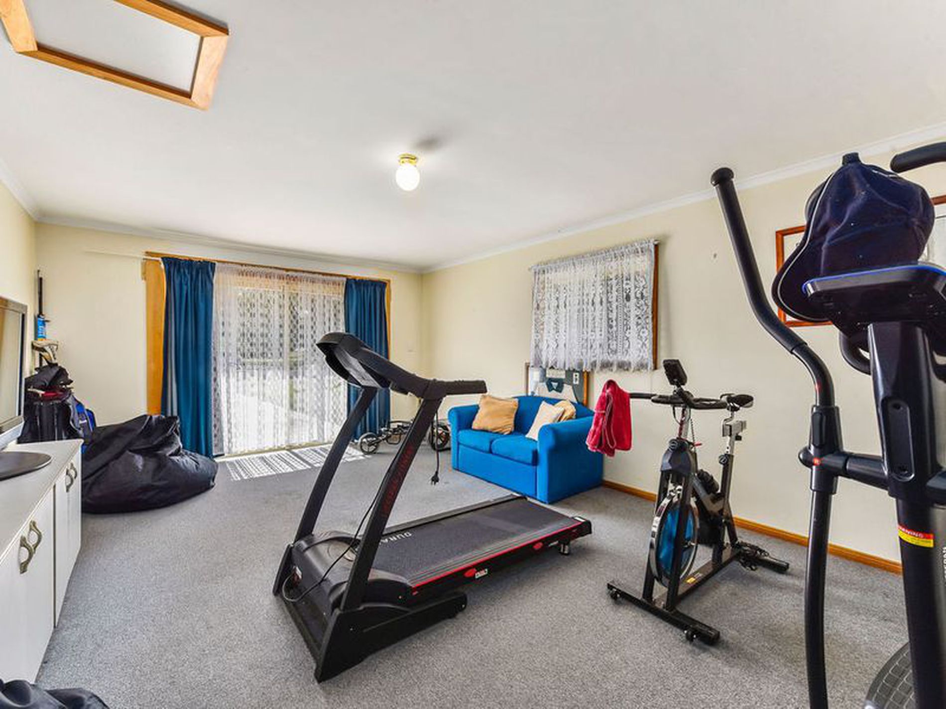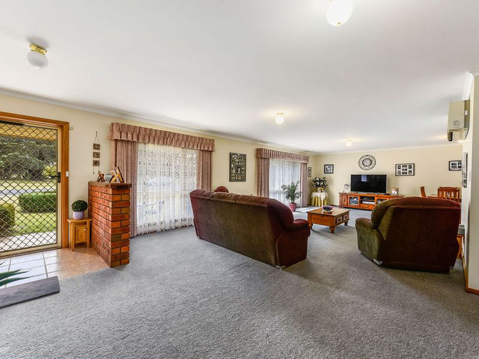 The family room is a spacious, open plan area of 10m in length, with plush carpet and a reverse cycle air conditioner.