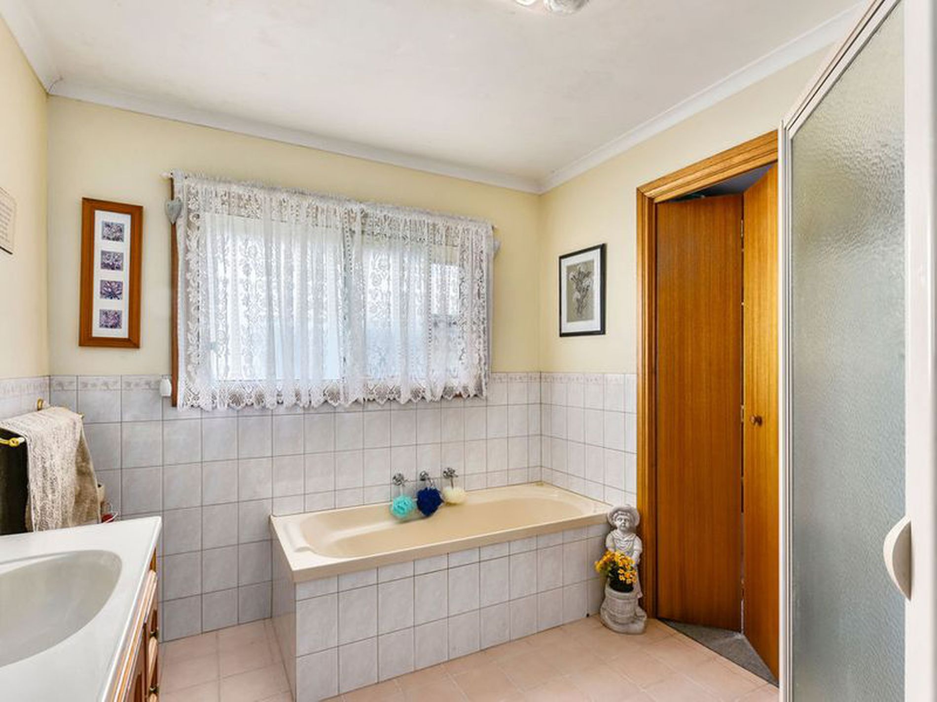 The tiled bathroom features a shower, bath and vanity as well as an adjacent separate toilet.