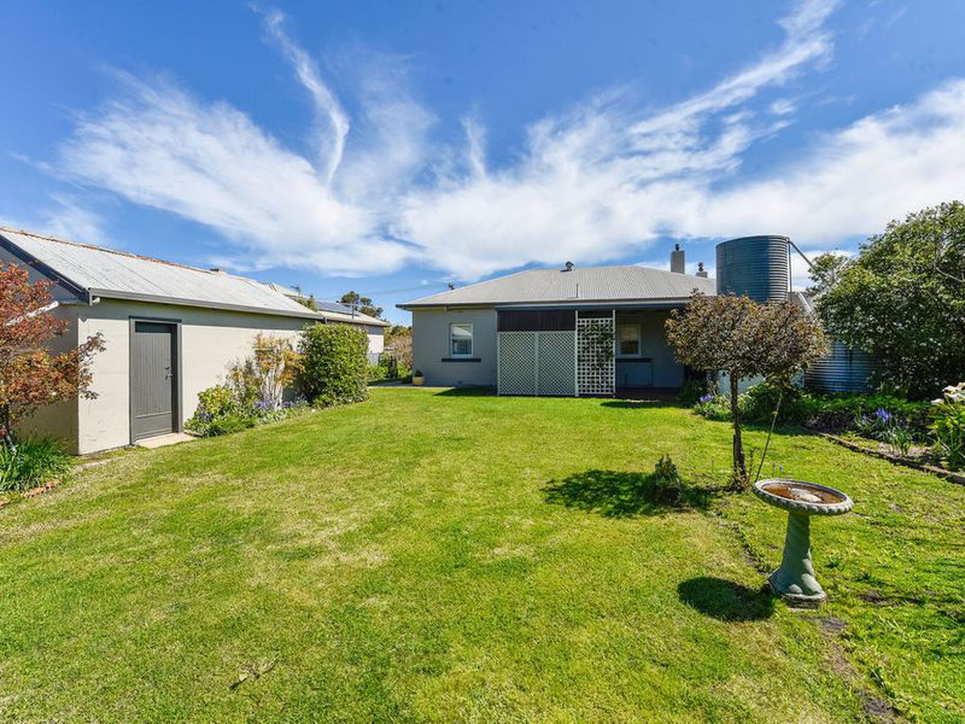 Stone shed with roller door, plus garden shed. Fruit trees and established framed garden.