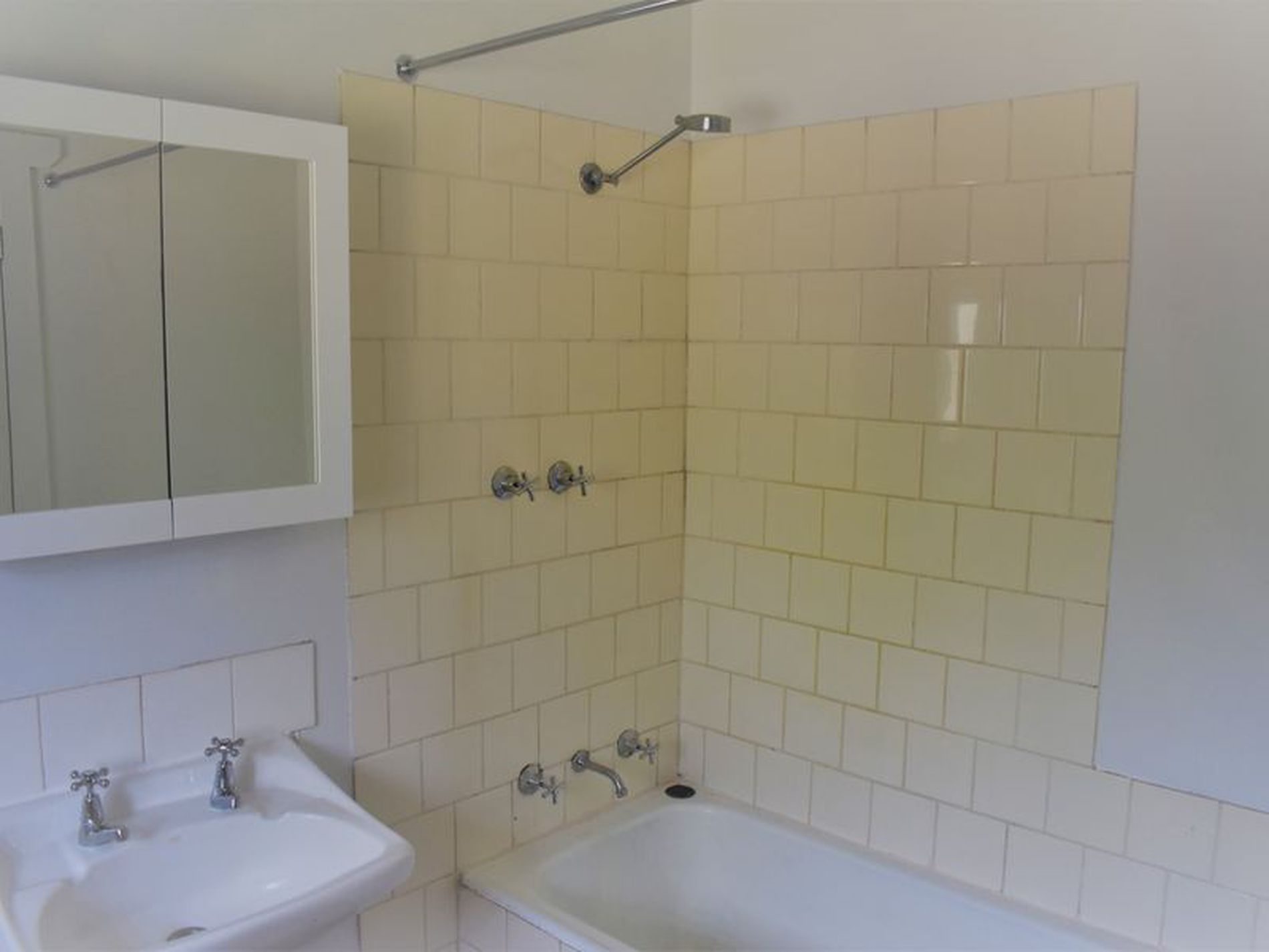 Bathroom with shower over bath ,toilet, vanity