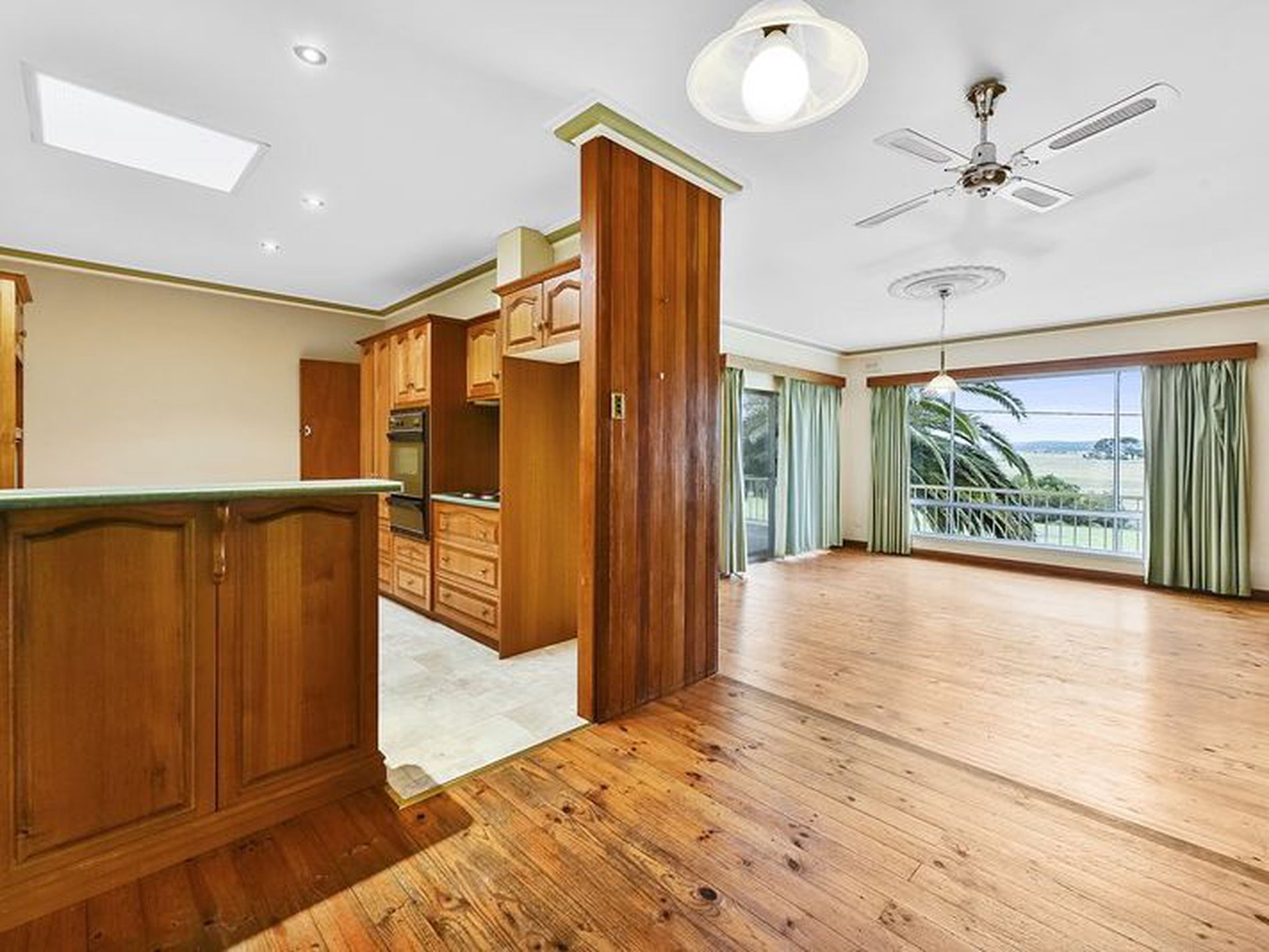 Large living room with floor boards, split system air con + gas log fire. Full length windows providing fantastic rural views.