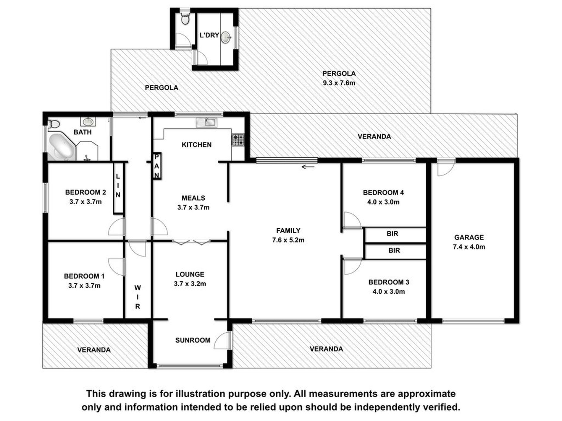 This leads to a cosy carpeted lounge which is adjacent and open to the tiled Kitchen / dining area. The light and bright kitchen offers electric oven with gas cook-top and range hood, dishwasher and enough space for a huge kitchen table where family and friends can gather. A massive 7.6m x 5.2m family room is alongside the kitchen / dining area. This space is tiled with front and rear aspects. The slow combustion wood heater that warms the home is here as well as a split system reverse cycle air conditioner.