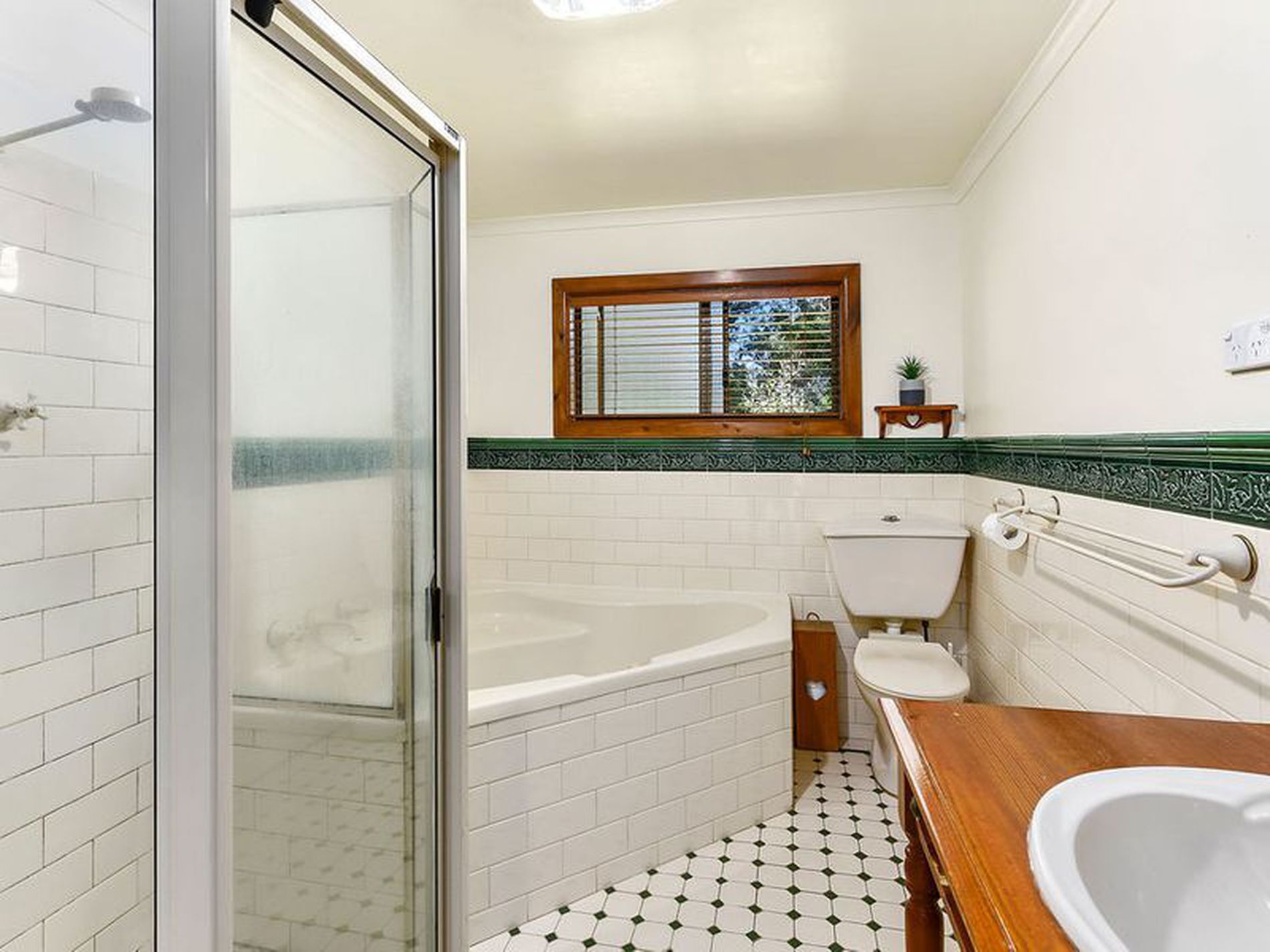 The bathroom is tiled and has separate corner spa bath, shower, vanity and toilet. A linen press offers storage nearby.