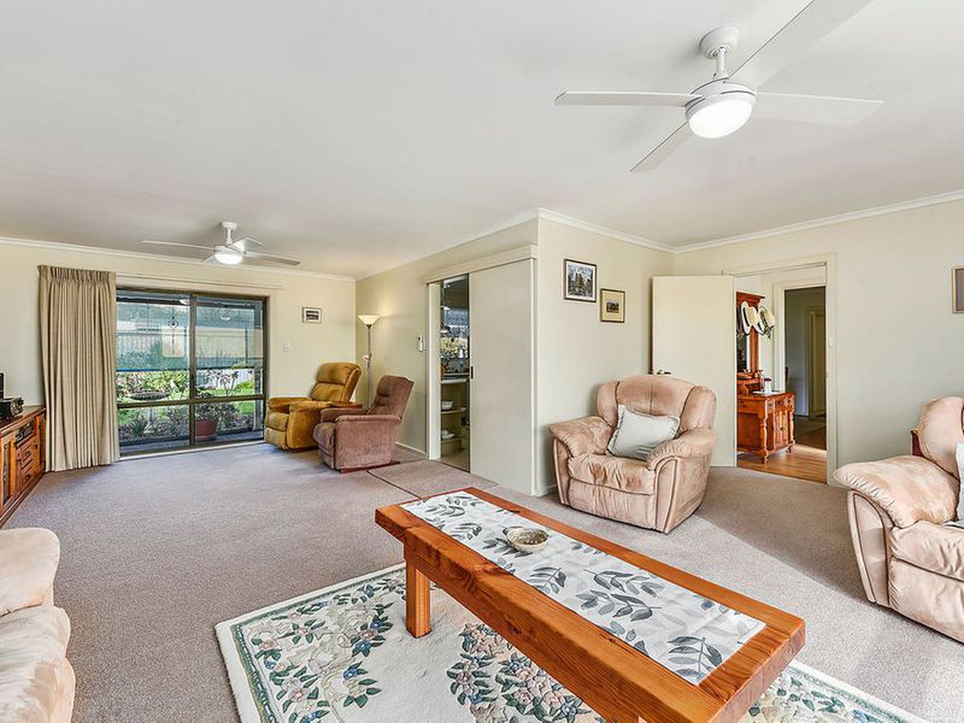Walk through the front door into the entrance with timber laminate flooring, to the left is a large L shaped lounge room with brand new carpet and has slow combustion wood heating, and a ceiling fan.