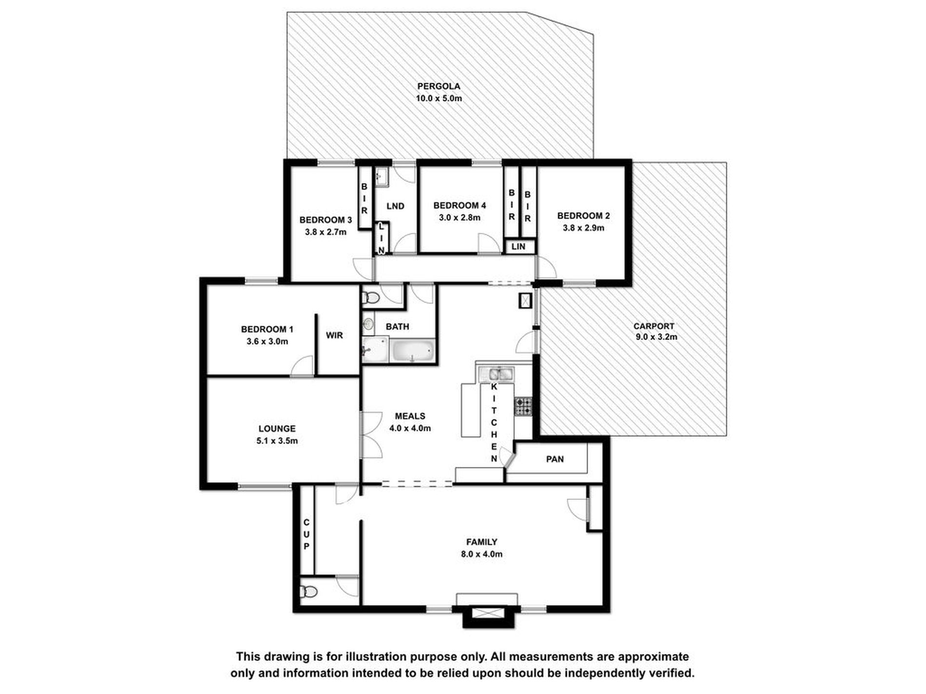 The home features four bedrooms, main with huge walk in robe while the other three have built ins, all are carpeted and have blinds.