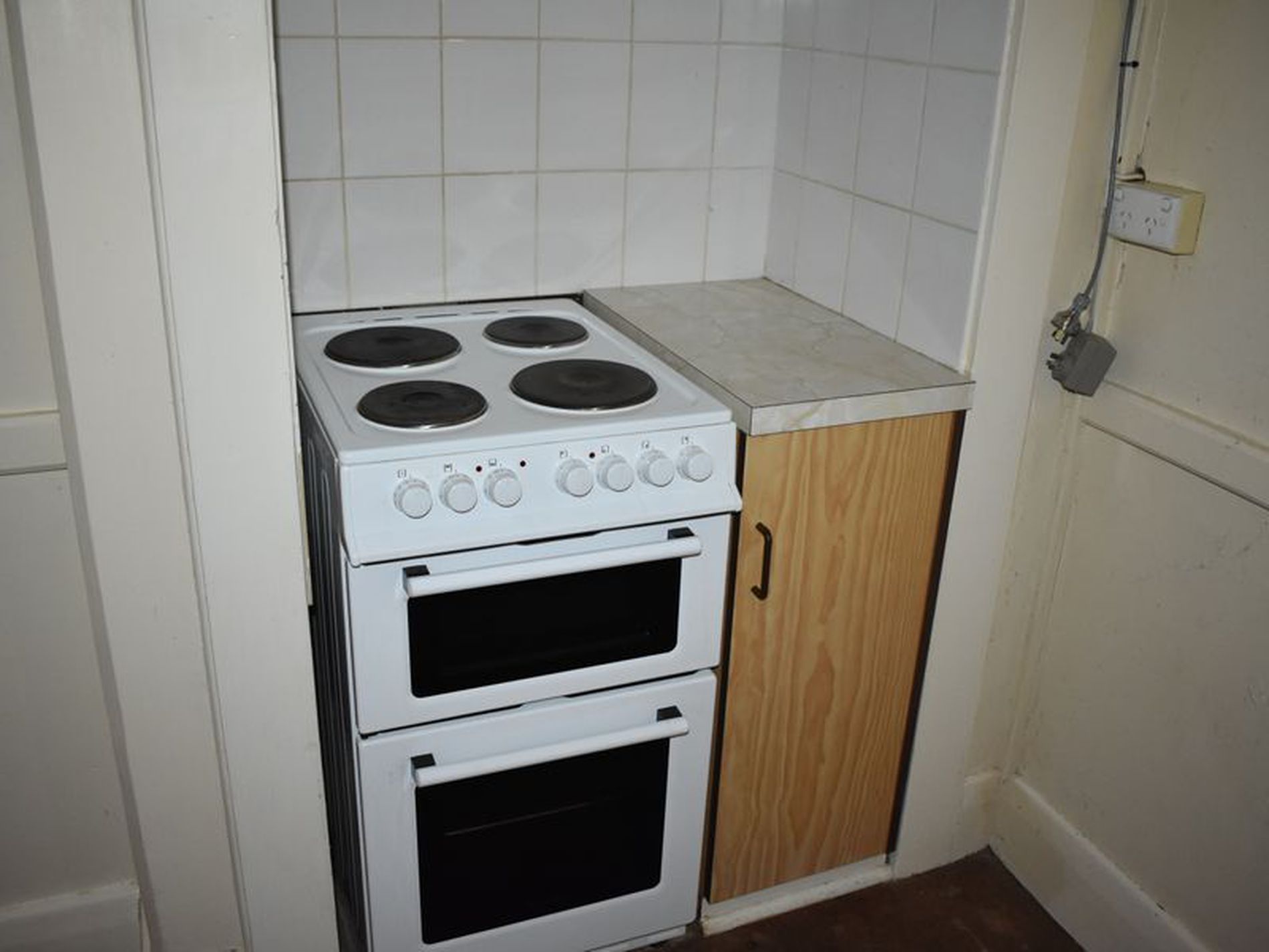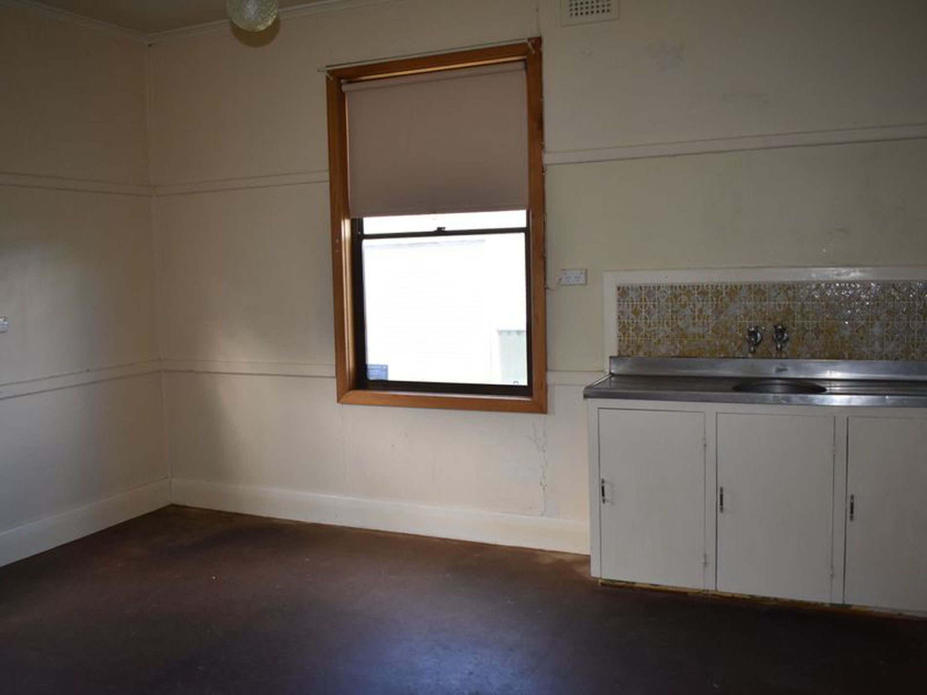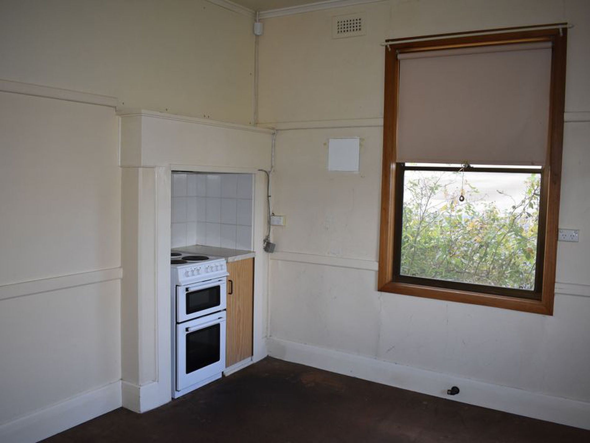 The kitchen is original with small sink, bench and electric oven.
