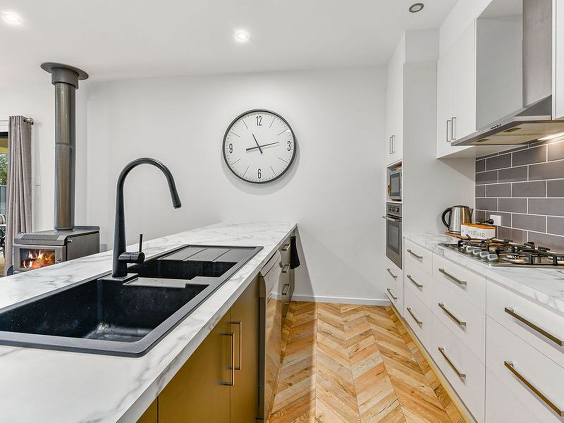 Enter through the front door and you will see your first WOW. Beautiful timber parquetry flooring greets you and runs through the open plan living area of the home. You have an open plan Kitchen, dining and living area. Treat yourself with the well appointed, functional kitchen it has a gas cook top, electric wall oven, range hood, dishwasher and a walk in pantry to hide away the clutter. A Large breakfast bar with a double black sink is a feature and there are ample drawers and cupboards.