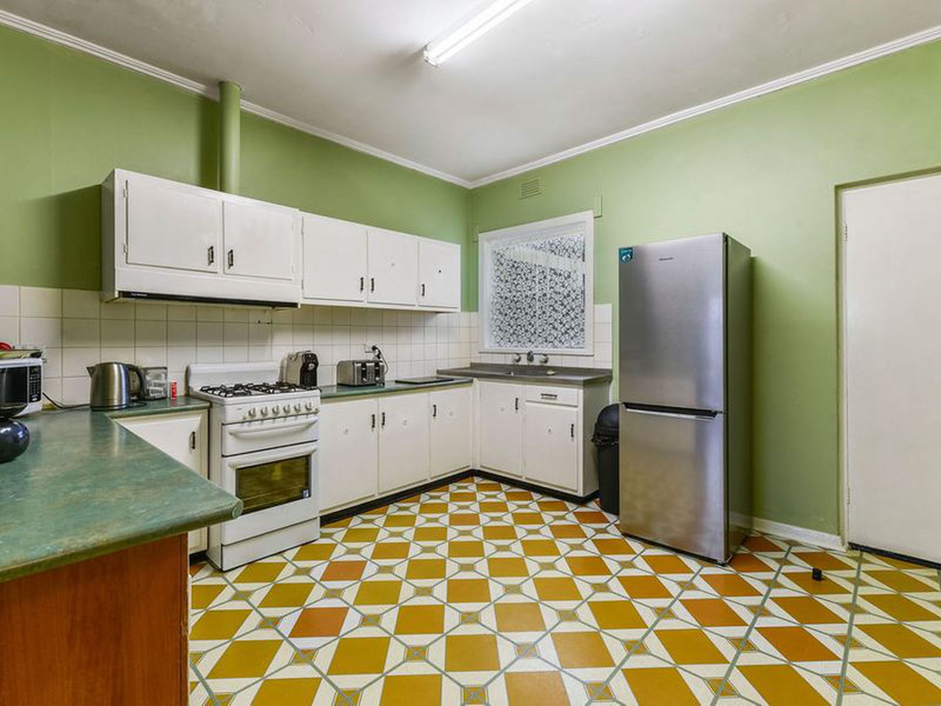 Opened up kitchen with large breakfast bench, gas stove and original cabinetry .