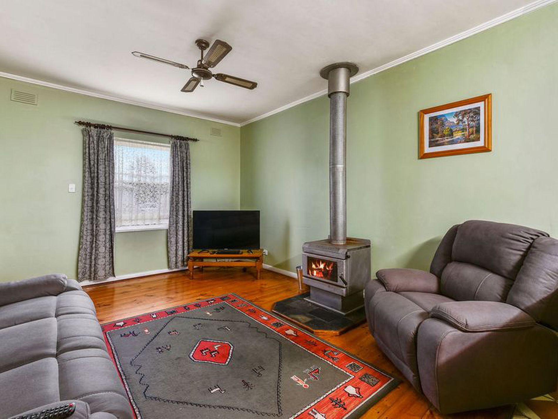 In excellent condition and well maintained. Enter directly into the lounge with polished timber floor, slow combustion fire and ceiling fan.
