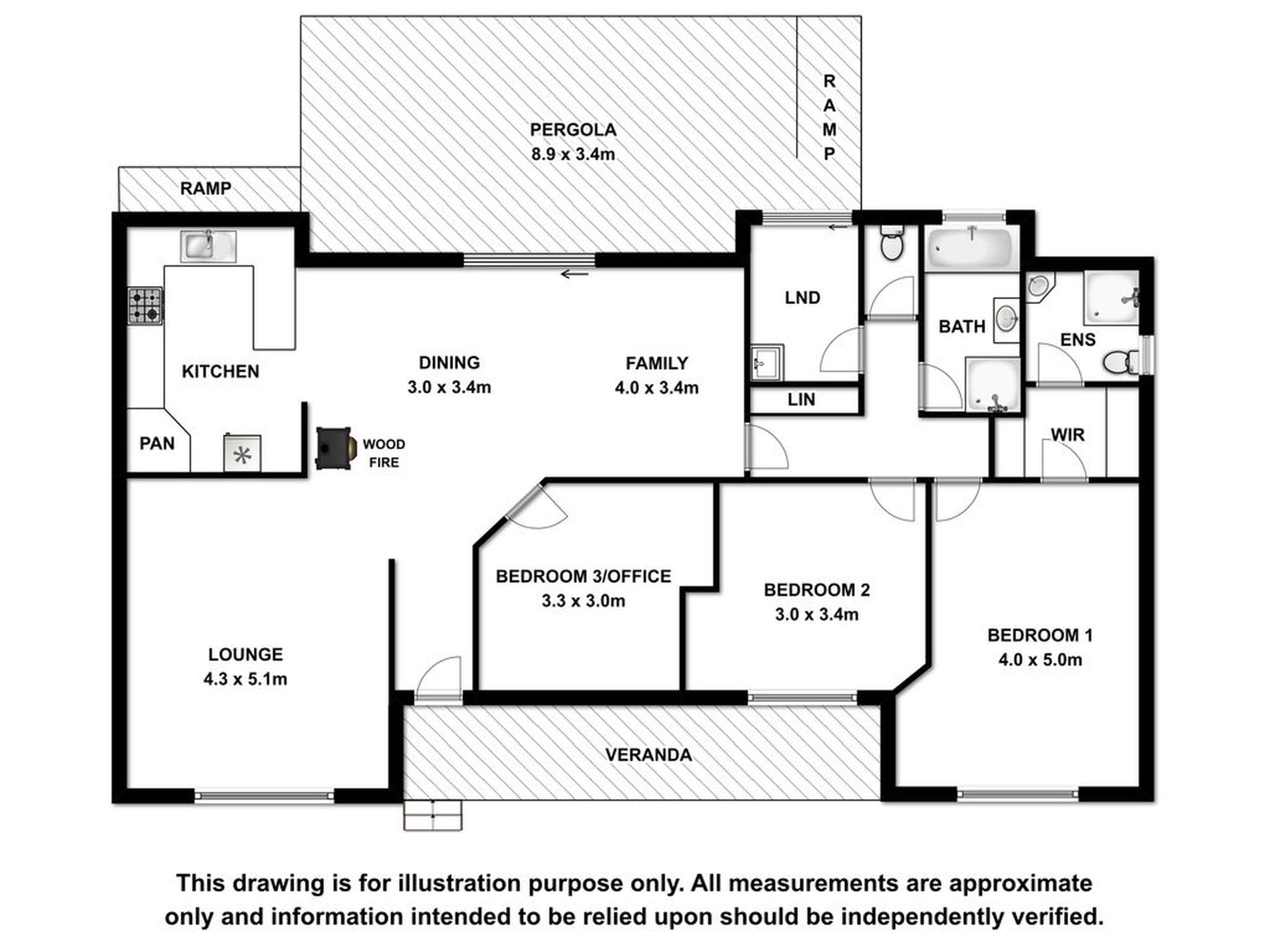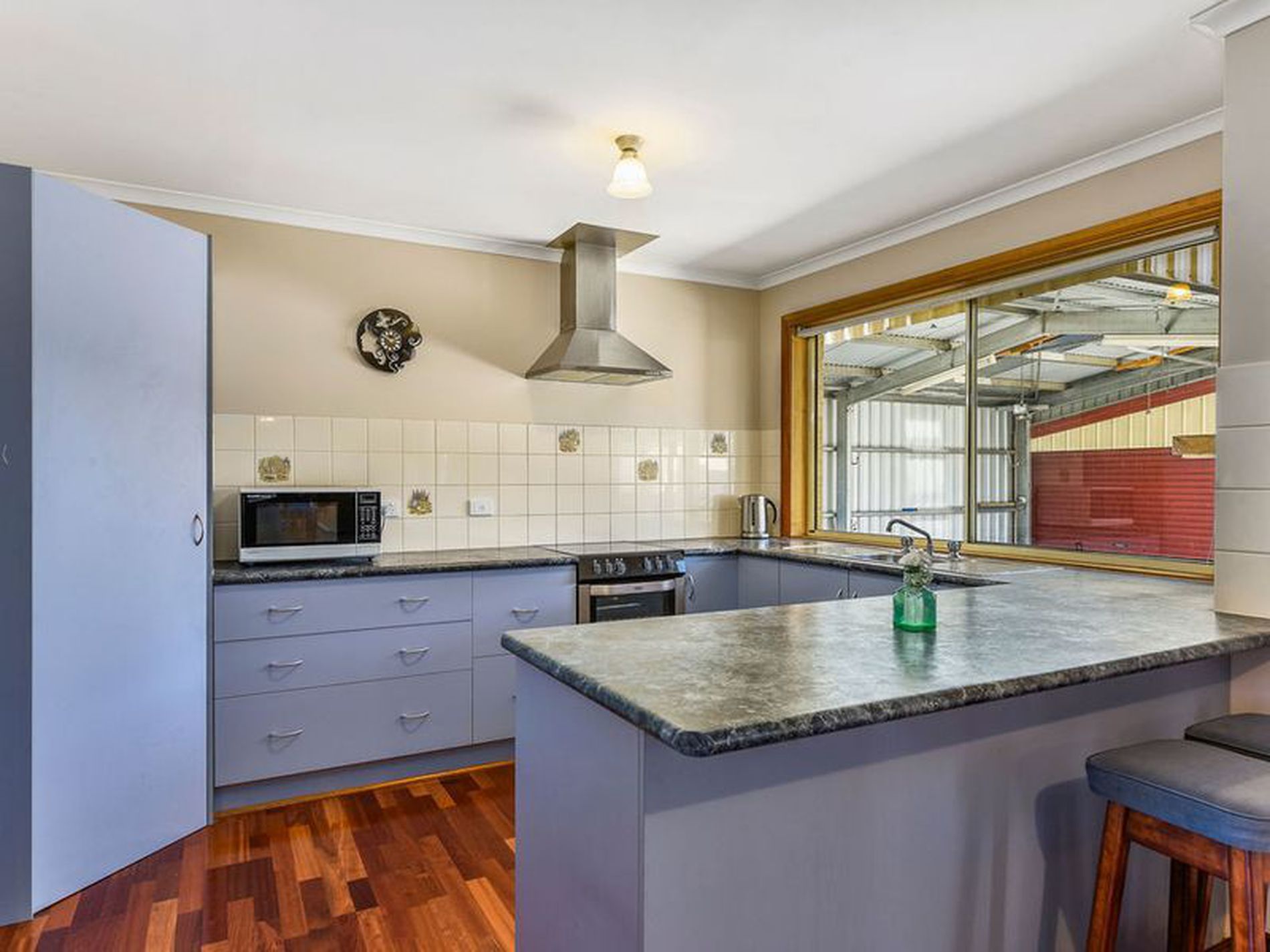 The home features an open plan kitchen/living/dining and lounge heated by a slow combustion wood fire and kept cool with a reverse cycle air conditioner.