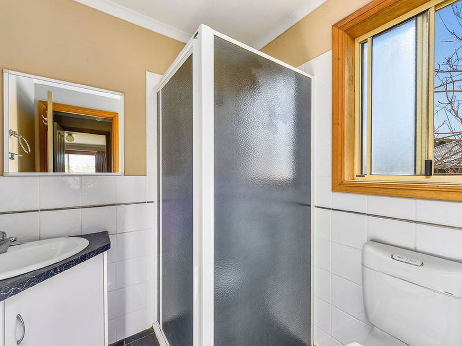 Spacious master bedroom has a reverse cycle air conditioner, WIR & ensuite with shower, vanity & toilet and has an exterior roller blind.