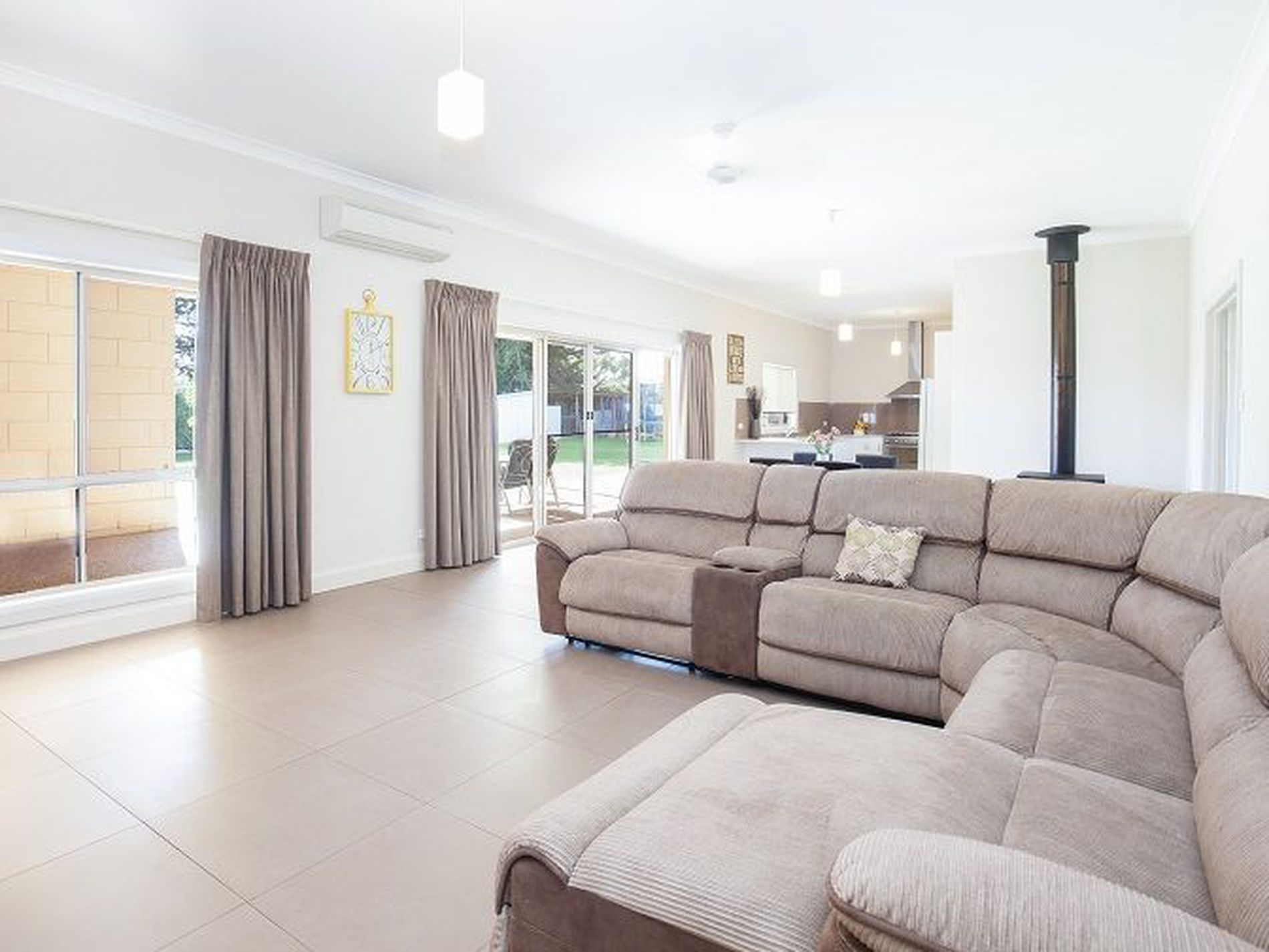 A quality built home by local builders the Reilly family. Solid Limestone interior and exterior construction. A massive allotment of 2,022m2 approx. Built only in 2014 it offers many impressive feature’s including 10ft ceilings, bull nose verandah and stylish open plan with large 60cm tiles in main living areas. The large open plan dining and living area is comforted with a slow combustion wood fire as well as a reverse cycle air conditioner and ceiling fan. This area will thrill entertainers with plenty of space and utilize.