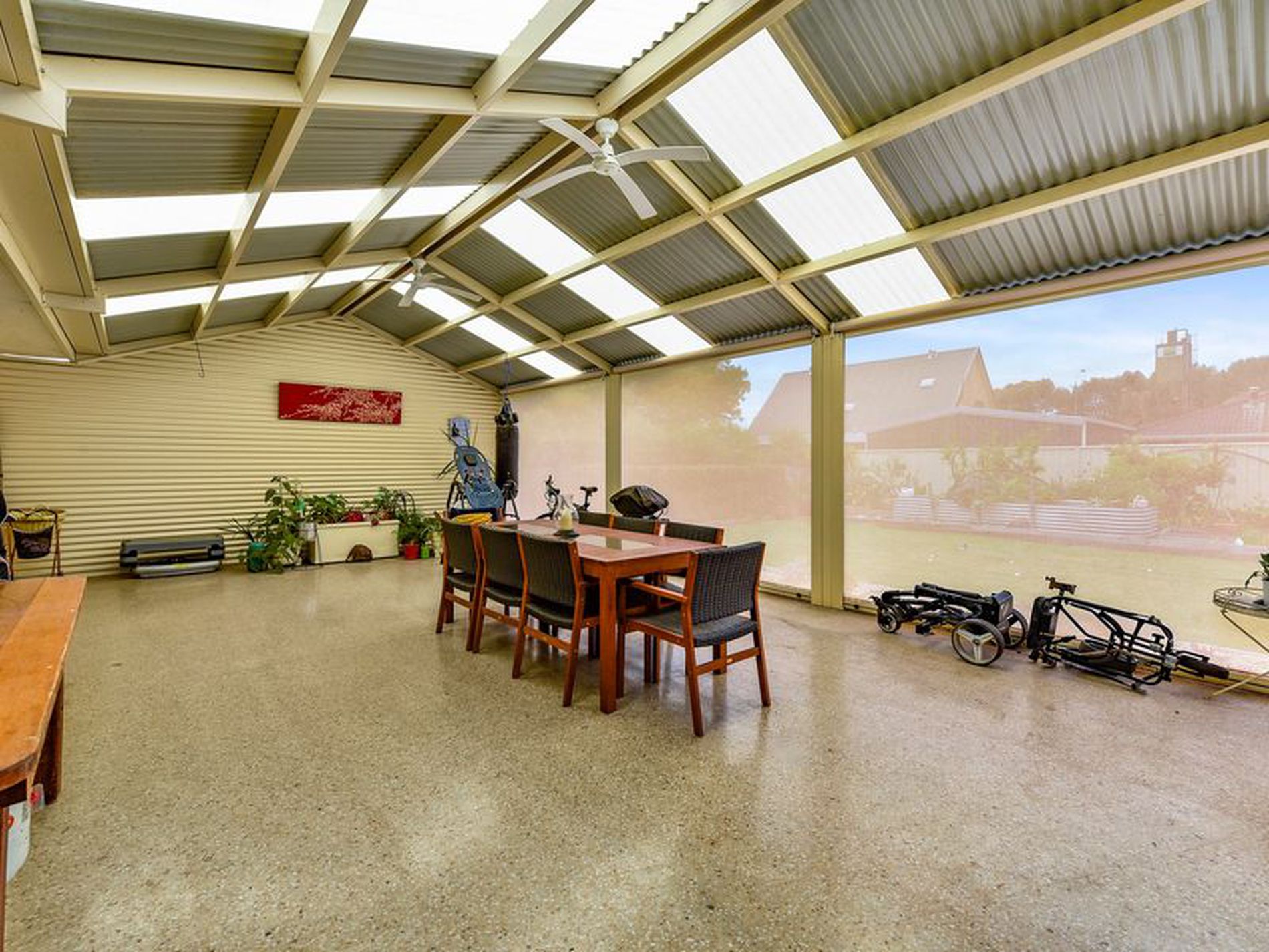 • Superb undercover entertaining area a massive 10x5 m2 with gable roof, beautiful easy care polished concrete floor, ceiling fan and zip track blinds to open or enclose the area depending on the weather.