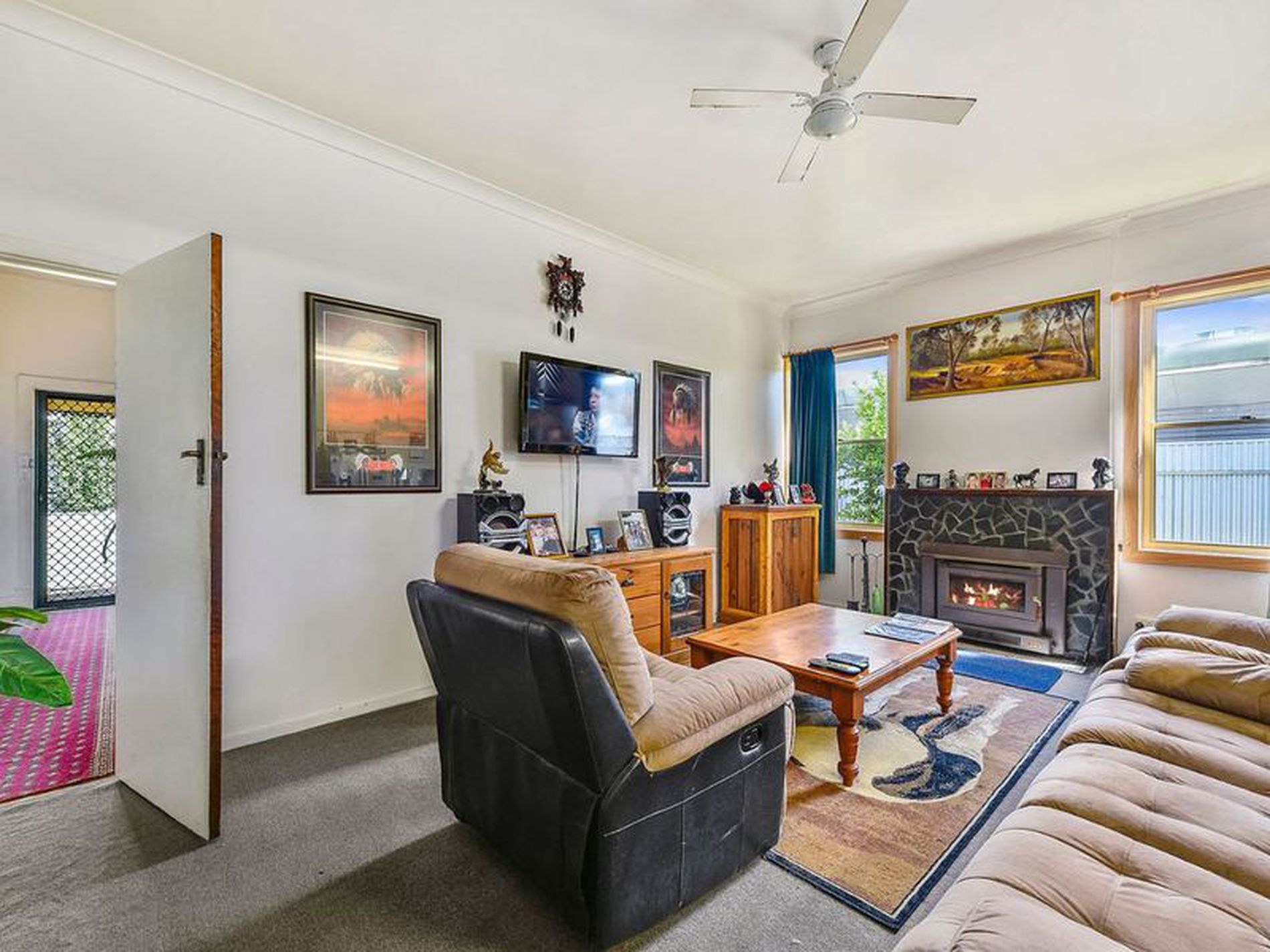 Carpeted lounge area with slow combustion fire and ceiling fan