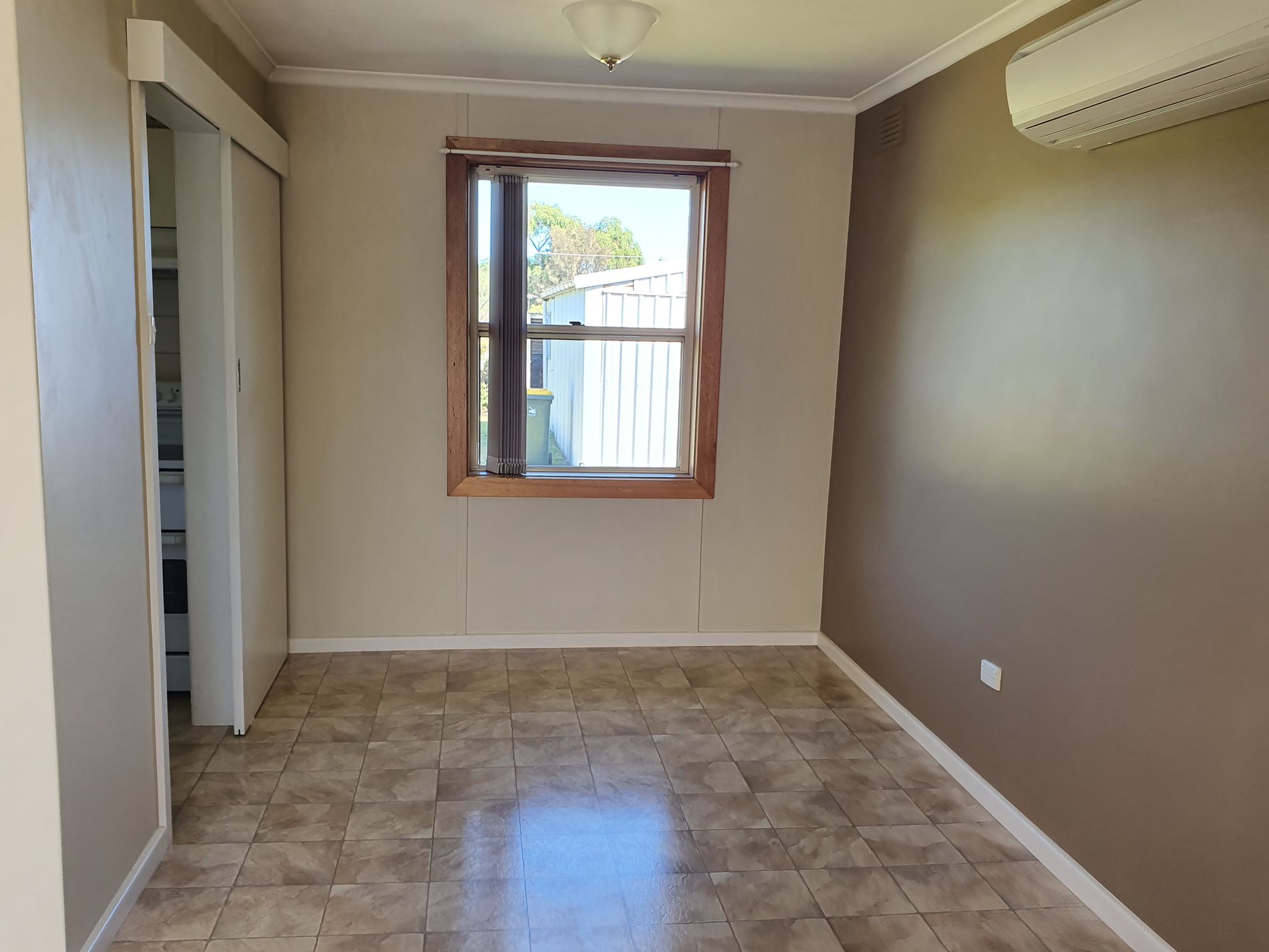 Living / Dining cosy wood heating with Air Conditioner reverse cycle unit for summer cooling.