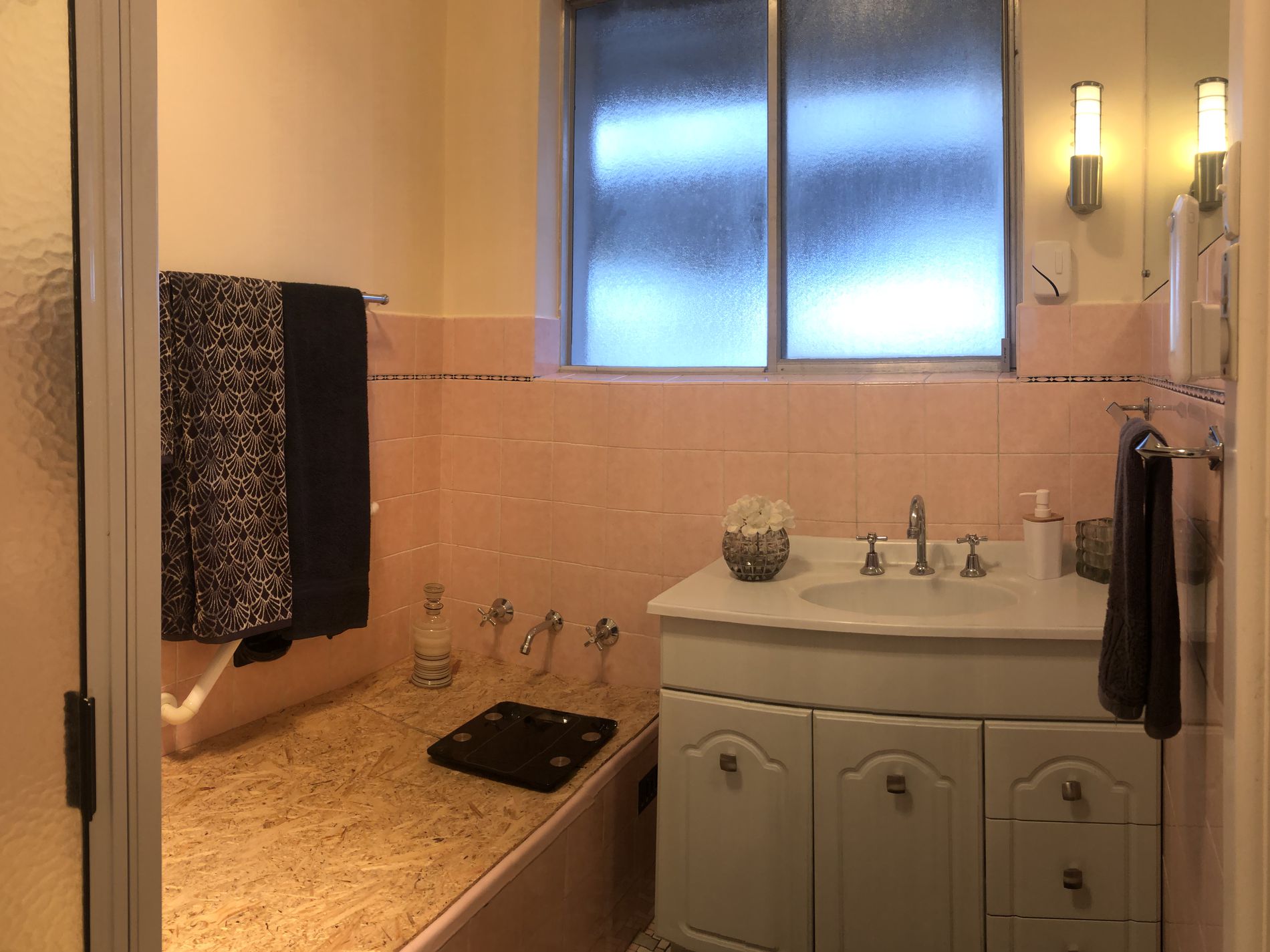 The bathroom is tiled, has a vanity, bath, shower, as well as heat lights. The toilet is separate, and the laundry adjoin and has a built-in linen press.
